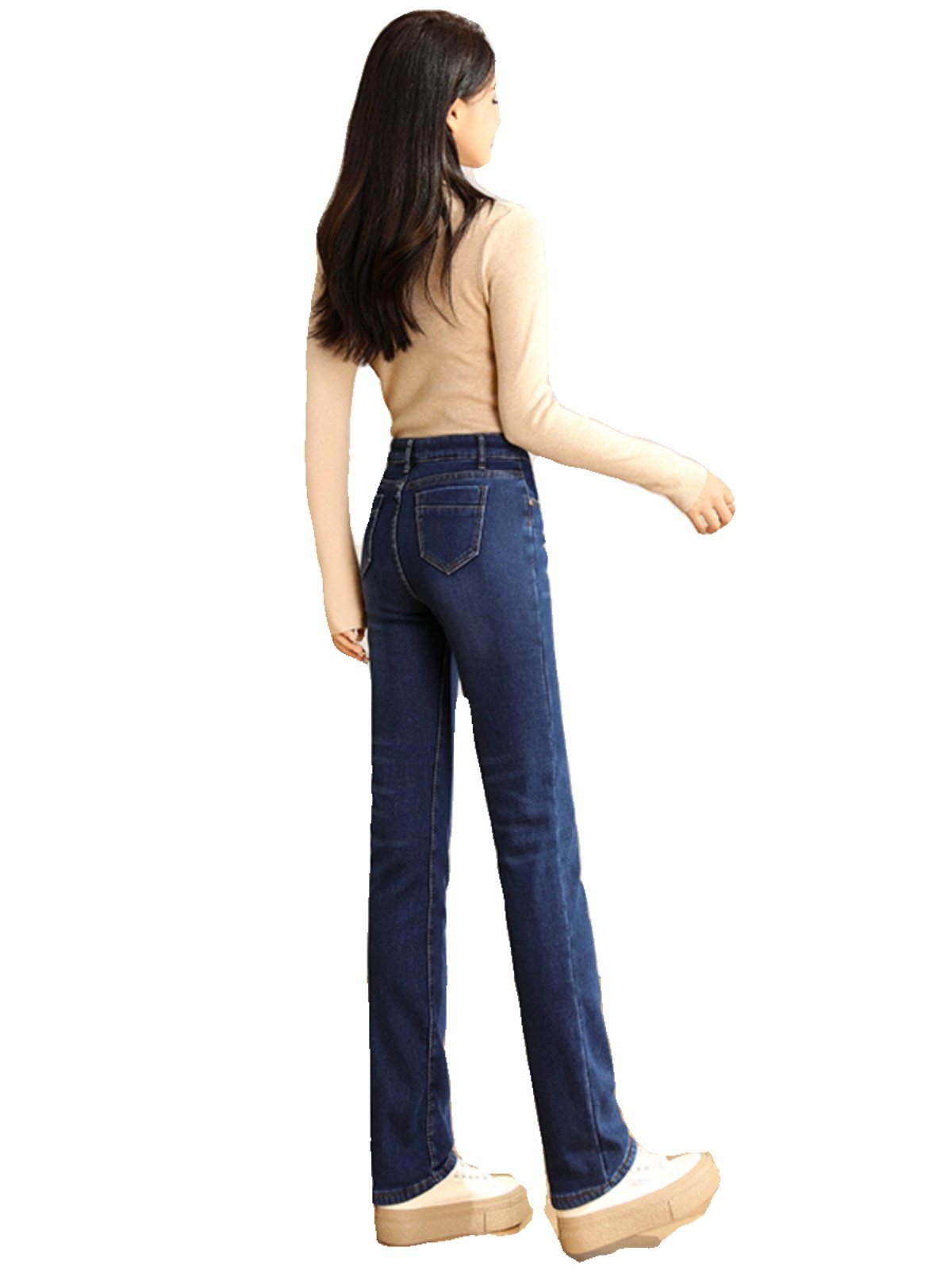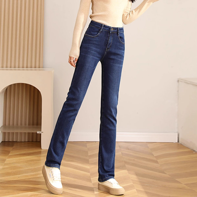 📚 深蓝色直筒加绒牛仔裤女2025秋冬季高腰窄版显瘦大码韩版烟管长裤