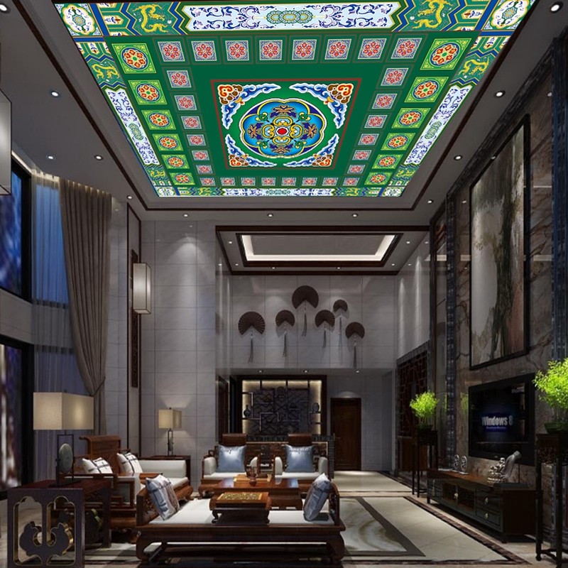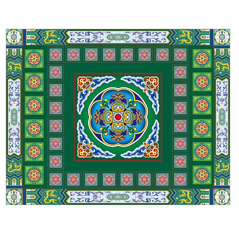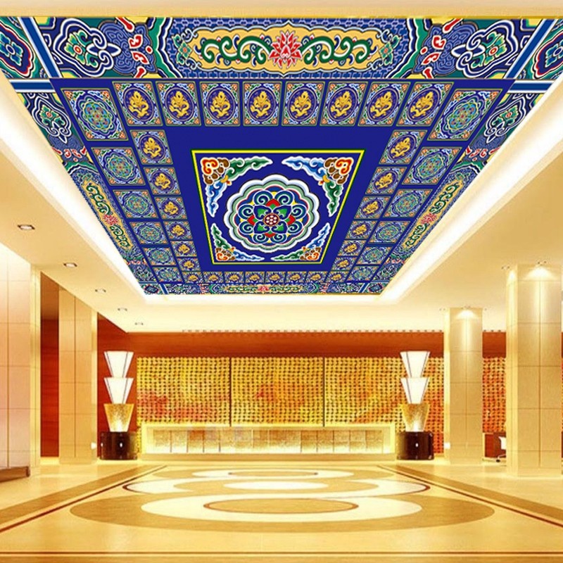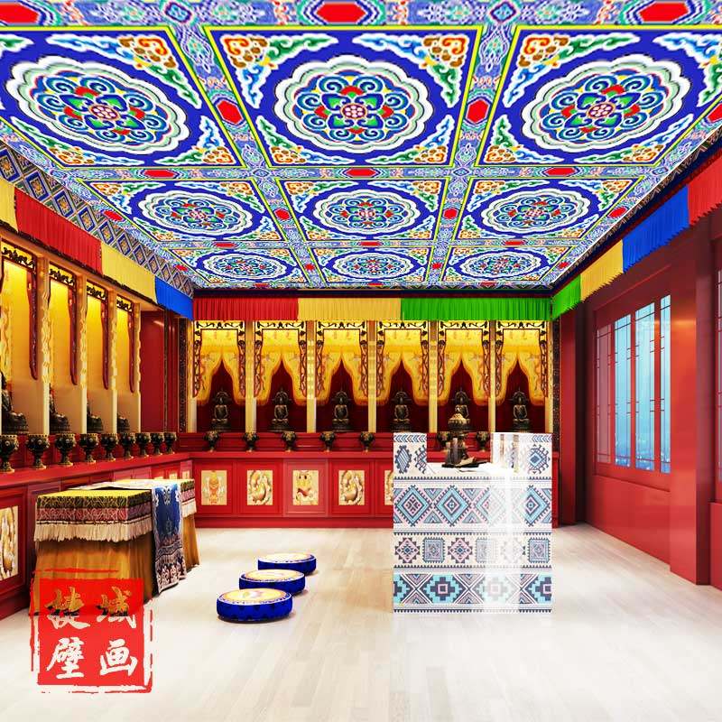 📚 佛堂吊顶墙纸房梁复古故宫花纹酒店金色莲花彩绘壁画寺庙仙堂壁纸