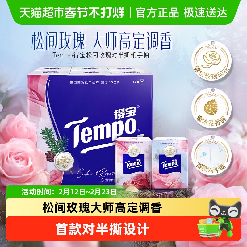 📚 Tempo/得宝雪松玫瑰香手帕纸4层对半撕印花餐巾纸便携纸巾