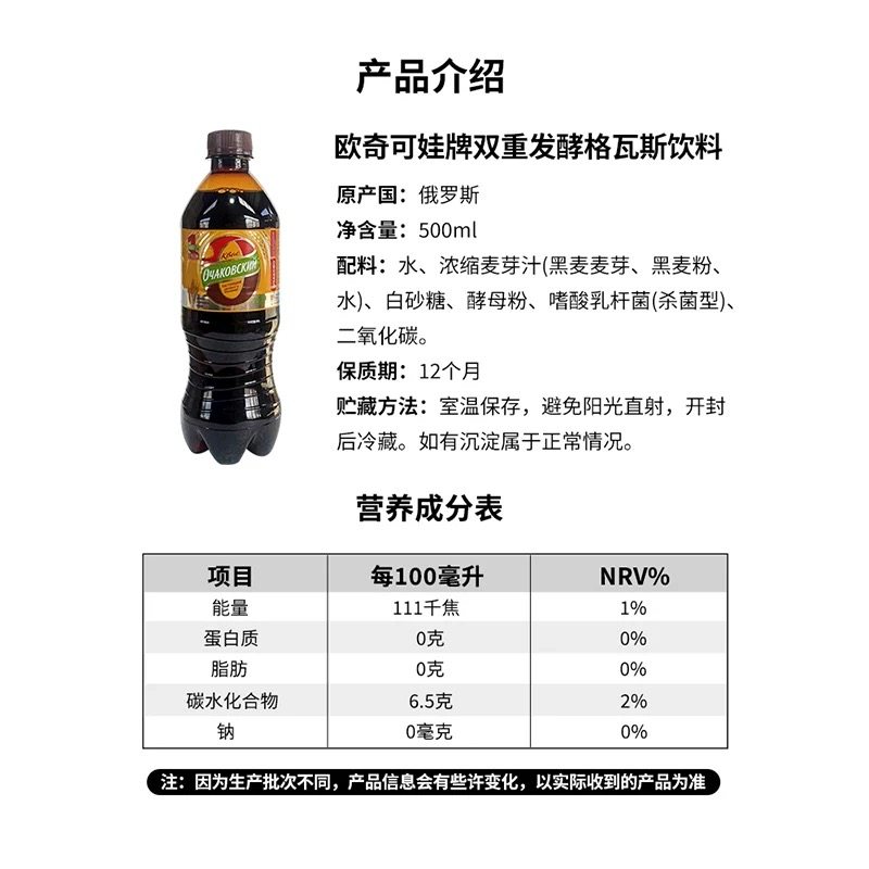 📚 俄罗斯纯进口格瓦斯欧奇可娃牌500ml/瓶 低卡0脂天然发酵助消化