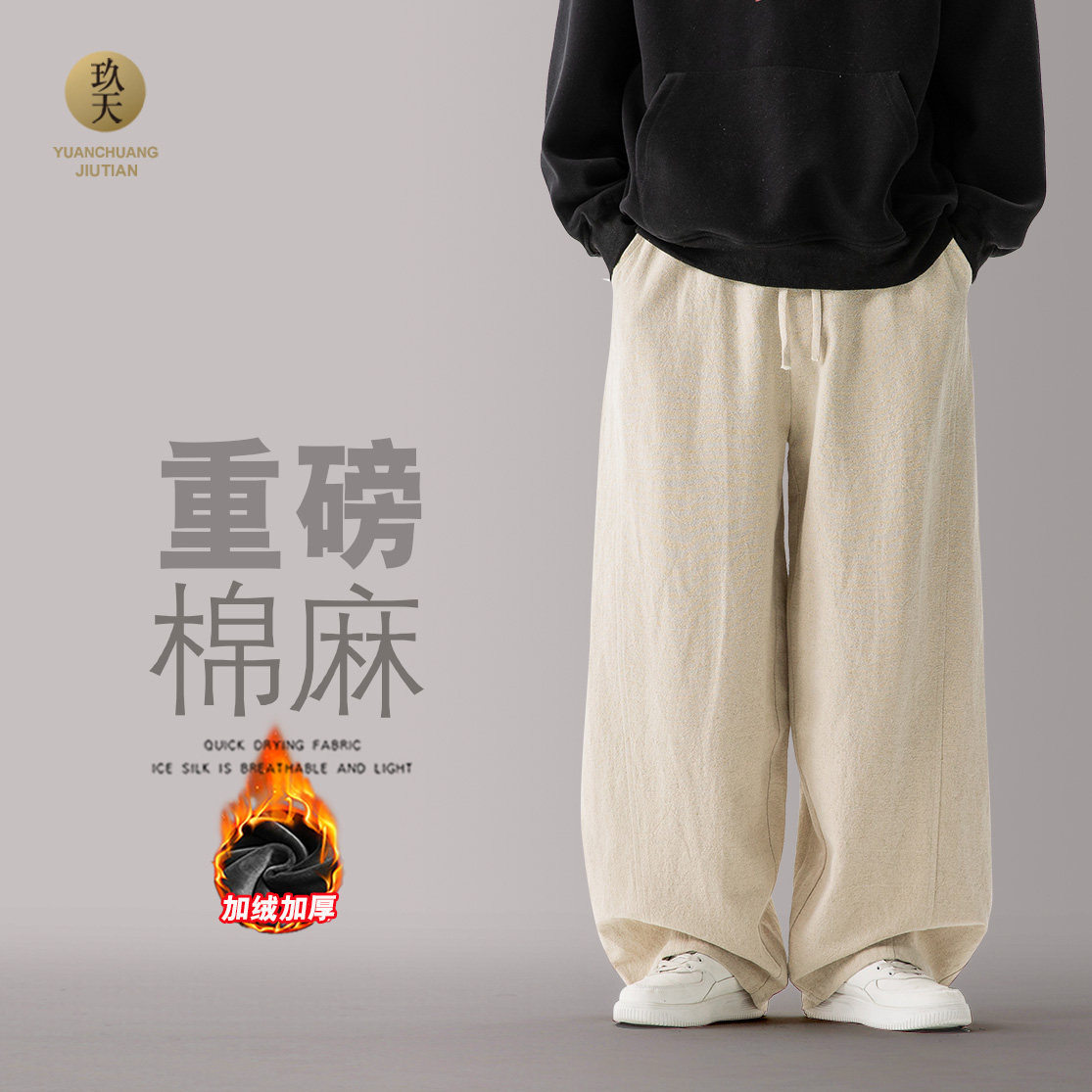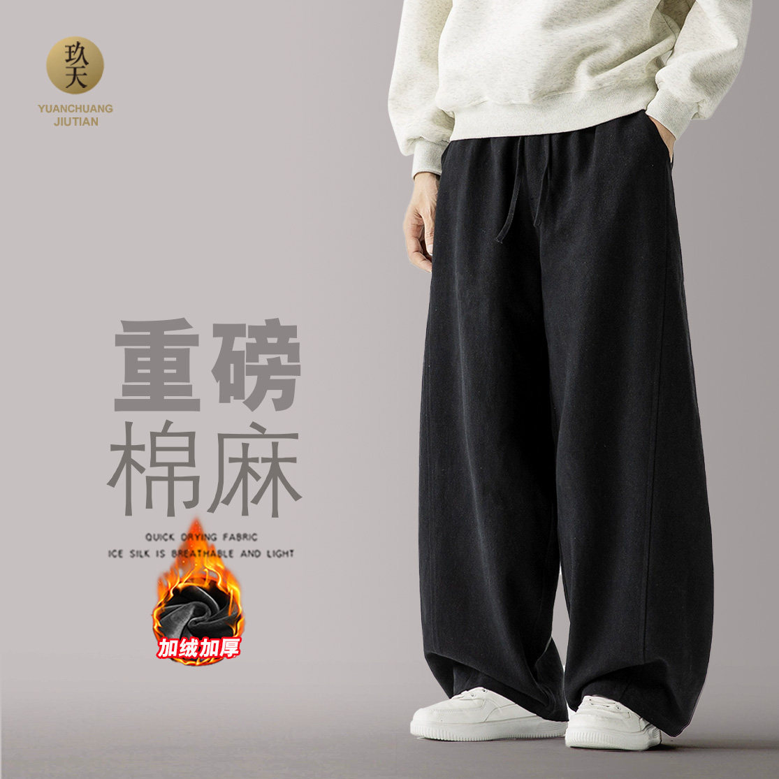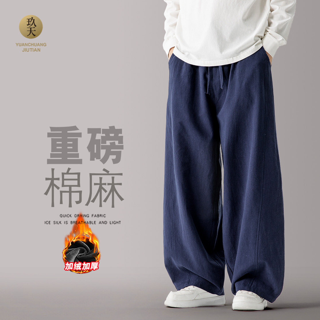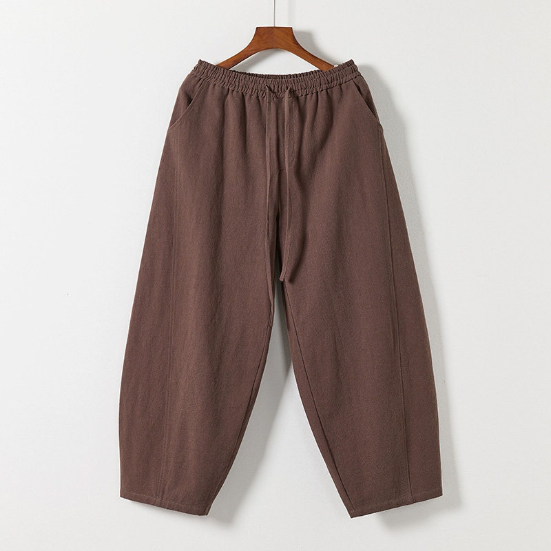 📚 秋冬中式休闲裤重磅棉麻阔腿裤亚麻弯刀裤男女直筒太极裤复古长裤
