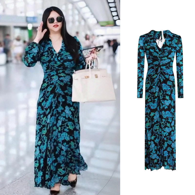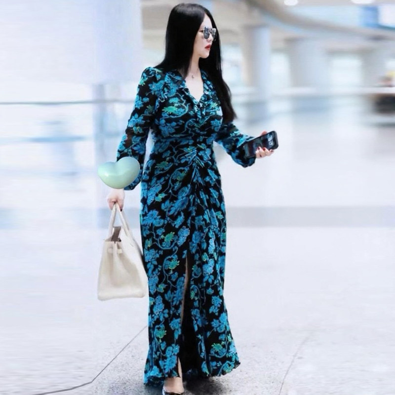 📚 李湘同款法式复古印花连衣裙女度假风收腰气质长袖v领包臀长裙子
