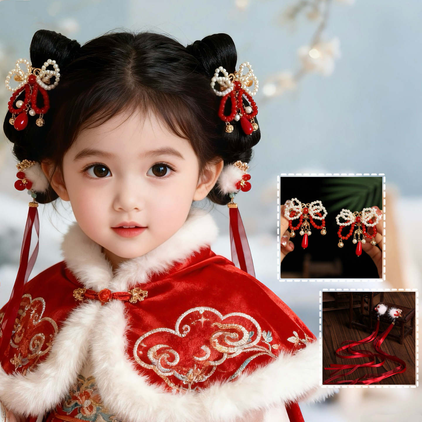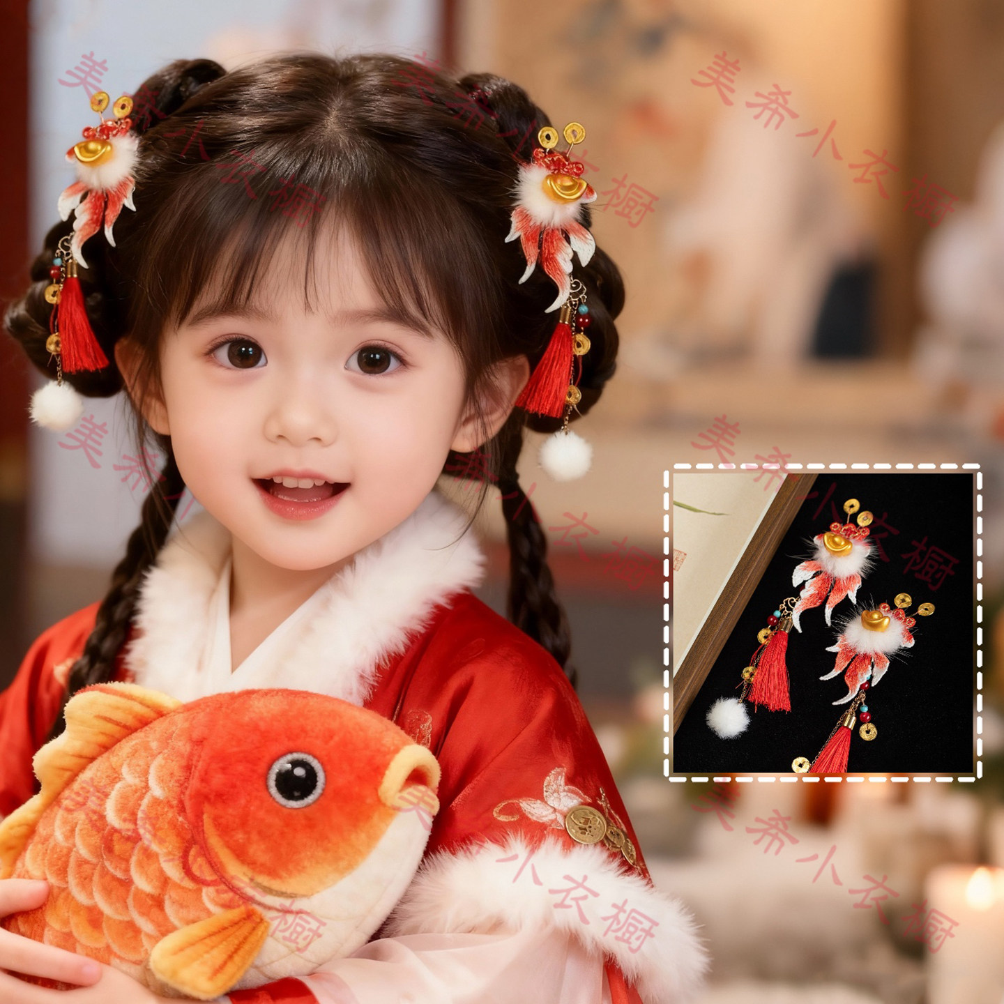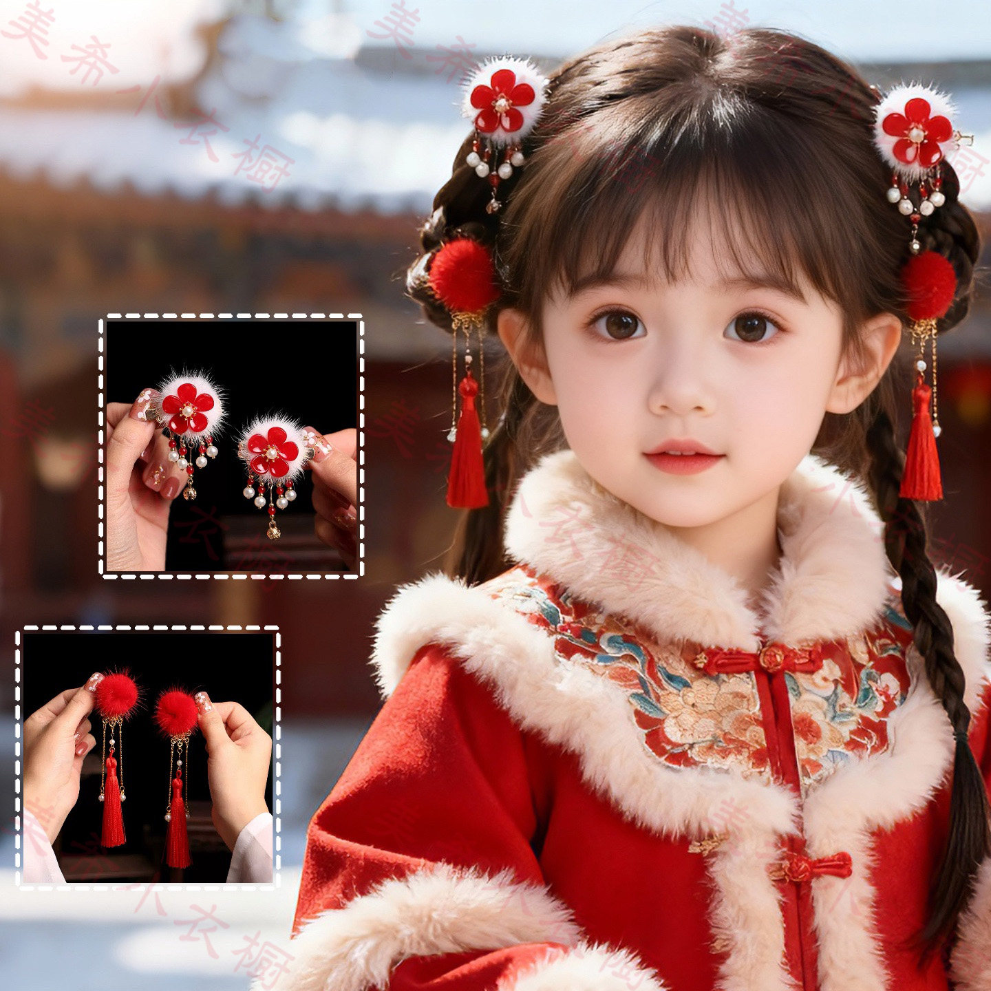 📚 汉服发饰女童红色小兔子发夹发冠发钗头饰明制配饰国风新年套装