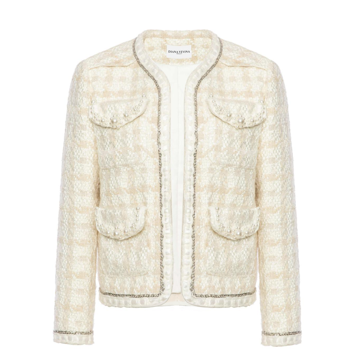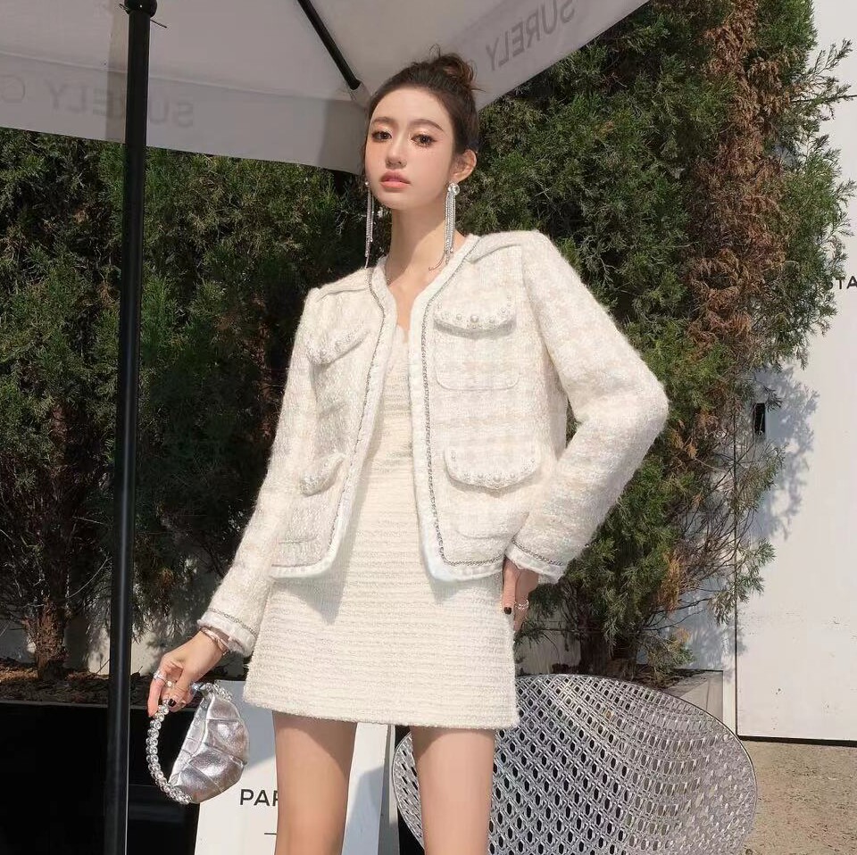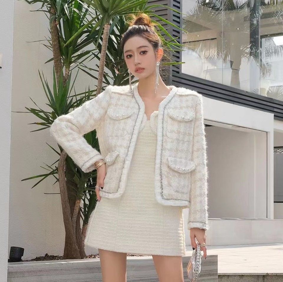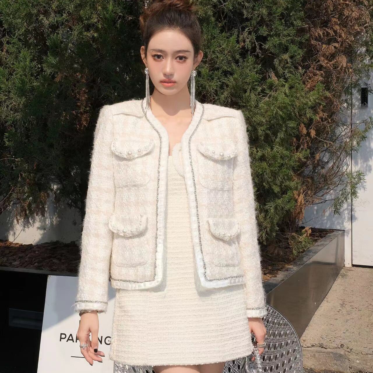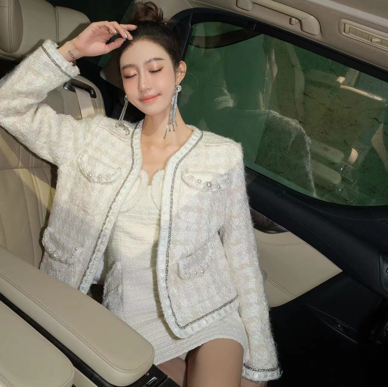 📚 【折】Diana Vevina 小香风珍珠镶边外套复古编织收腰吊带连衣裙