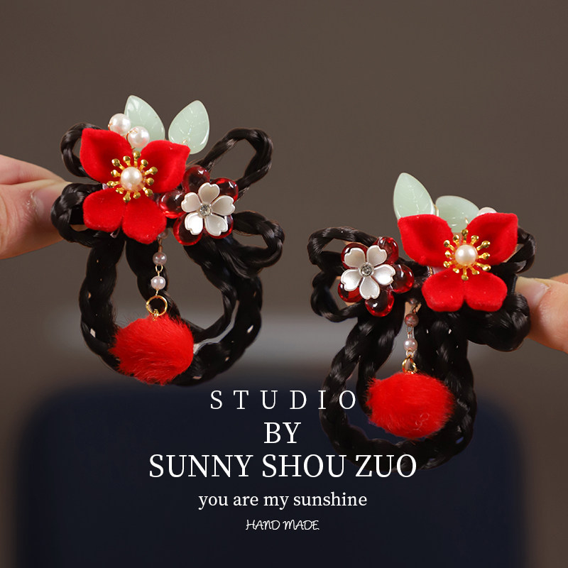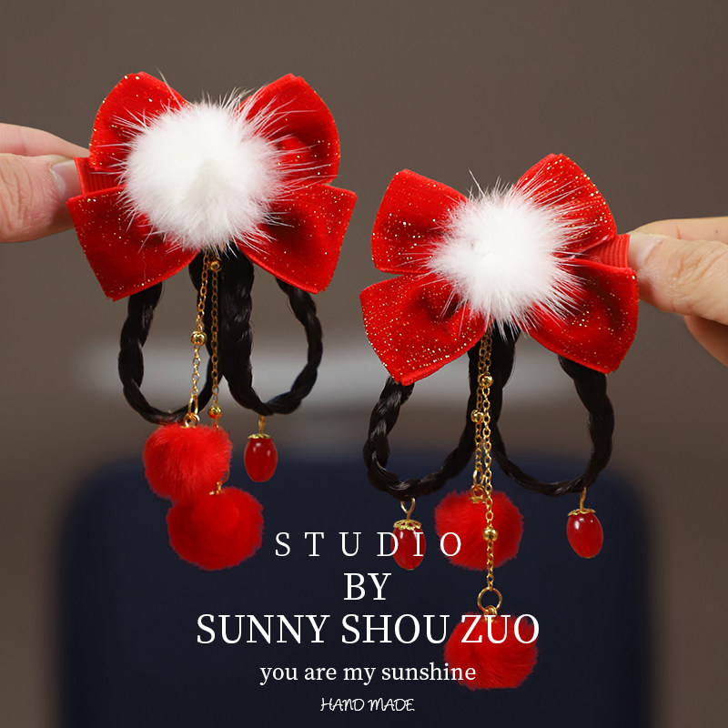 📚 2026新年喜庆女童古风汉服头饰新款宝宝周岁对夹拜年红色流苏发夹