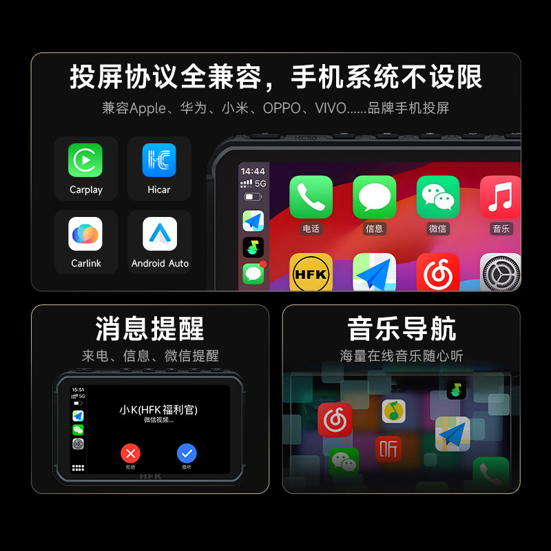 📚 HFK摩托车智能车机HC50行车记录仪2K前后双摄carplay导航夜视防水