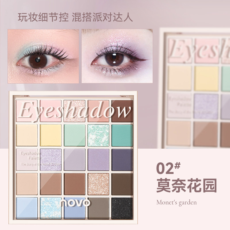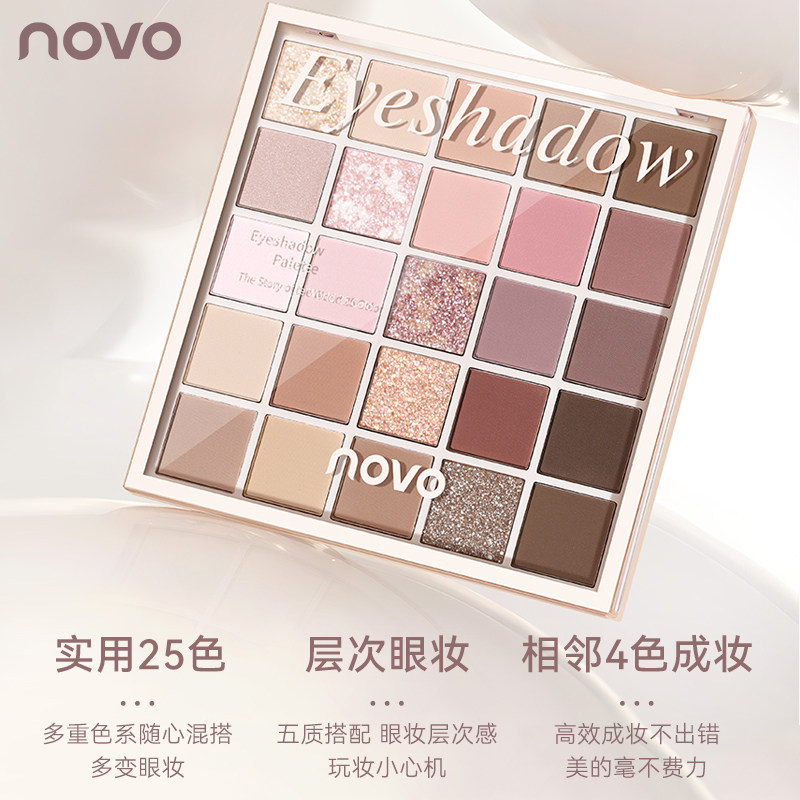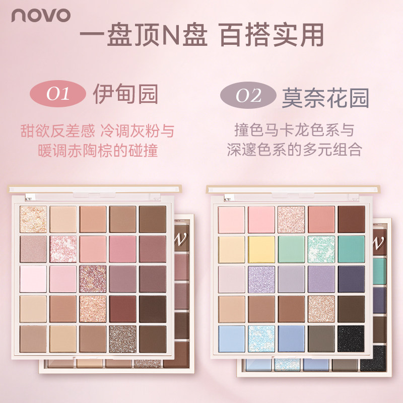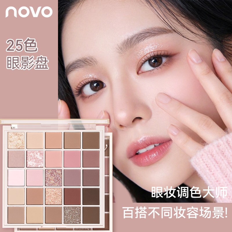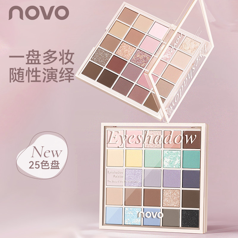 📚 乌托邦碎钻粉紫!novo25色眼影盘哑光低饱和莫兰迪蓝色黑金烟熏妆