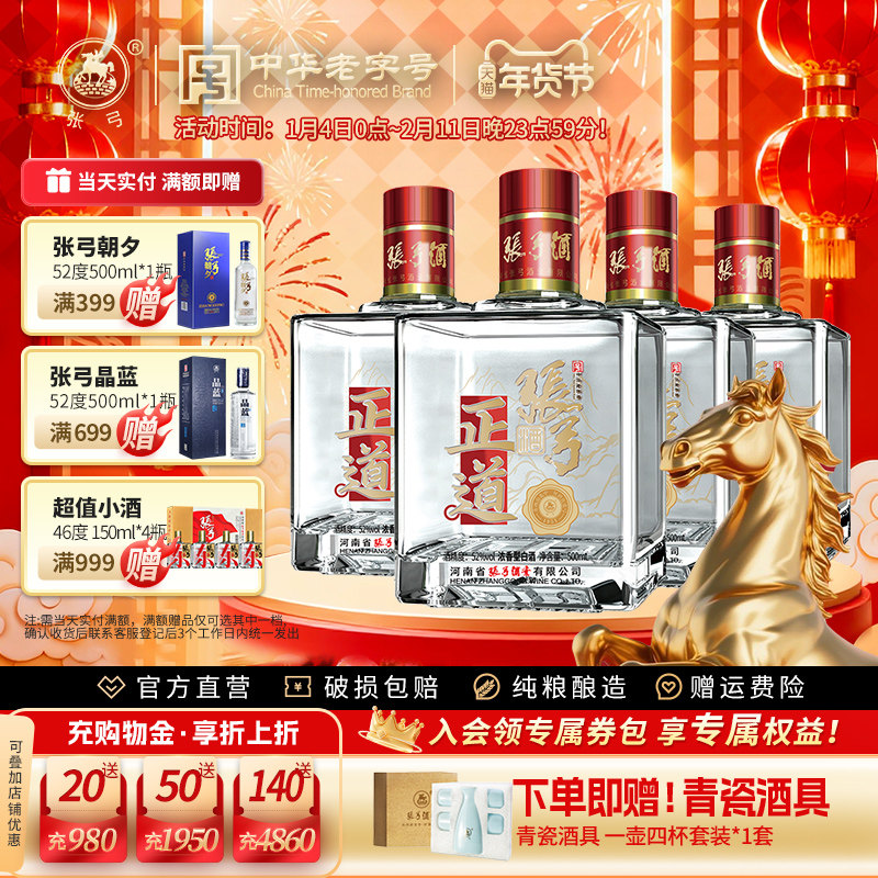 📚 【中华老字号】张弓酒正道版52度*4瓶浓香型固态纯粮食白酒整箱