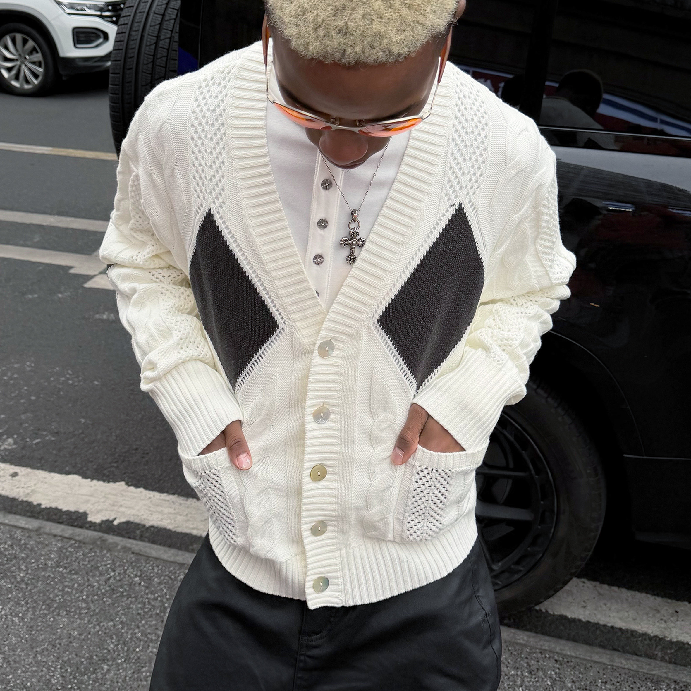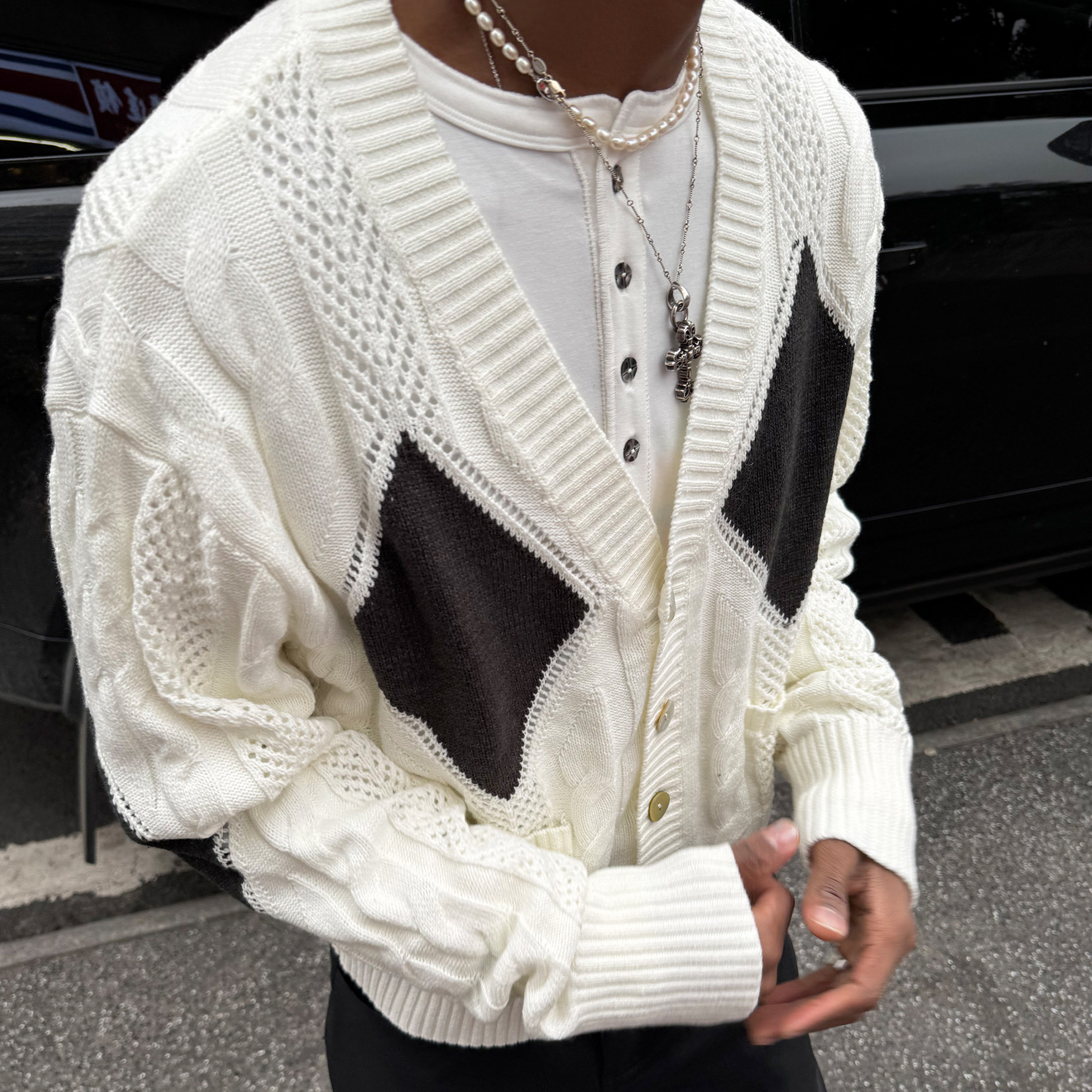 📚 STEEPC 复古绞花多层花型老钱菱格纹V领休闲短宽针织开衫毛衣外套