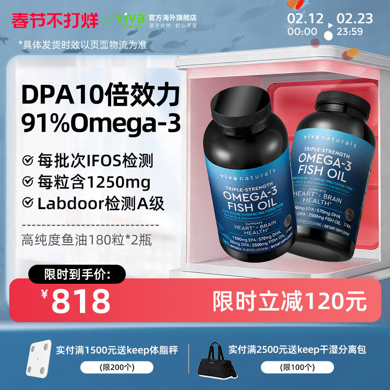 📚 Viva美国进口深海鱼油高含量omega3欧米茄3脂肪酸软胶囊180粒2瓶