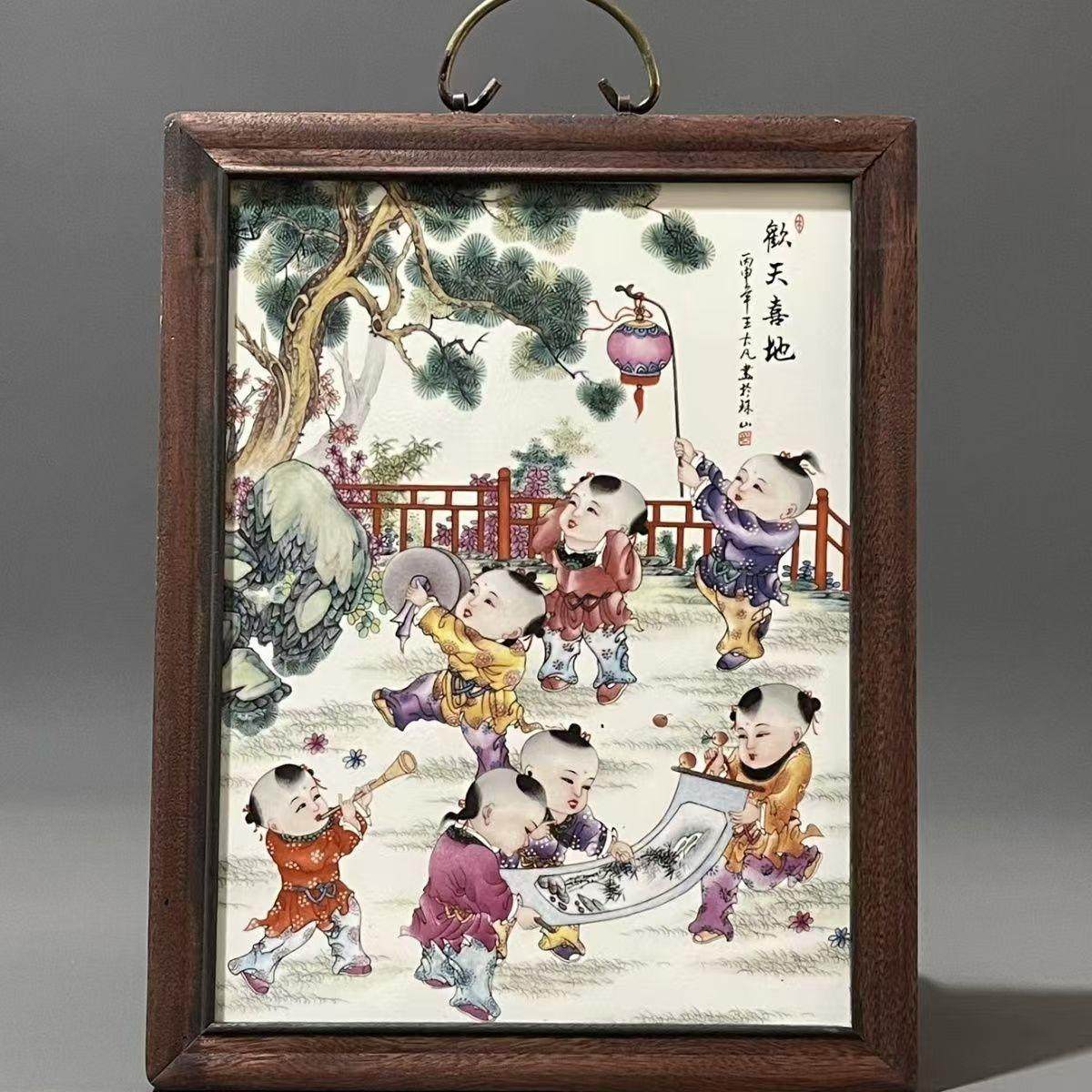 📚 特价清仓处理景德镇瓷板画镶粉彩童子欢天喜地挂屏陶瓷仿古装饰画