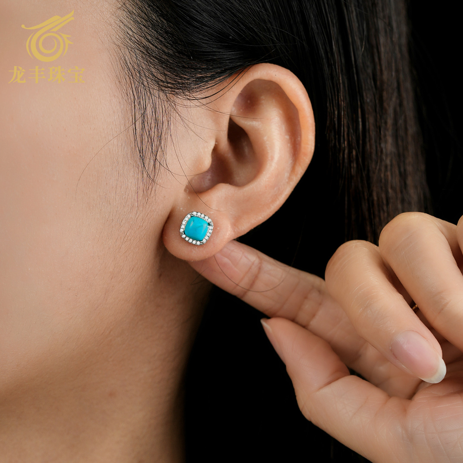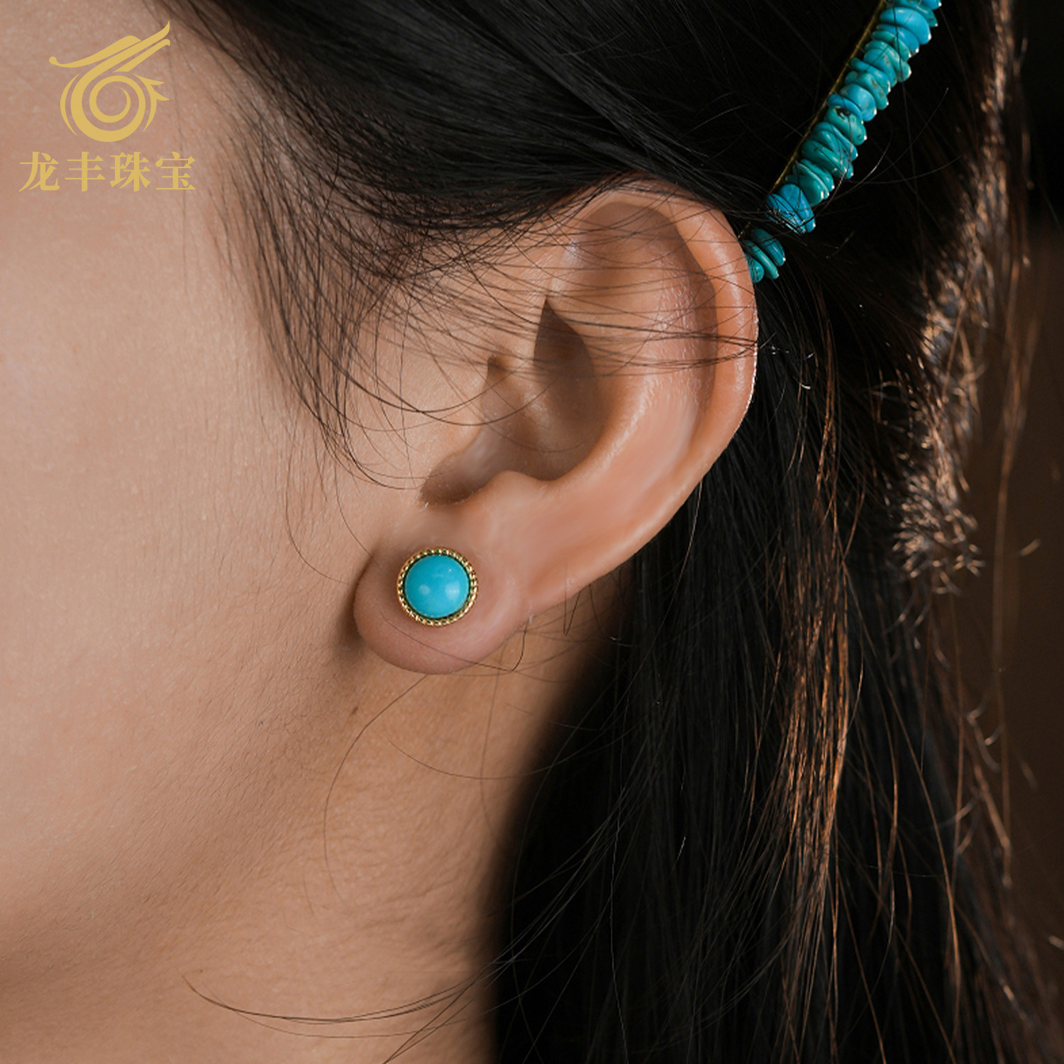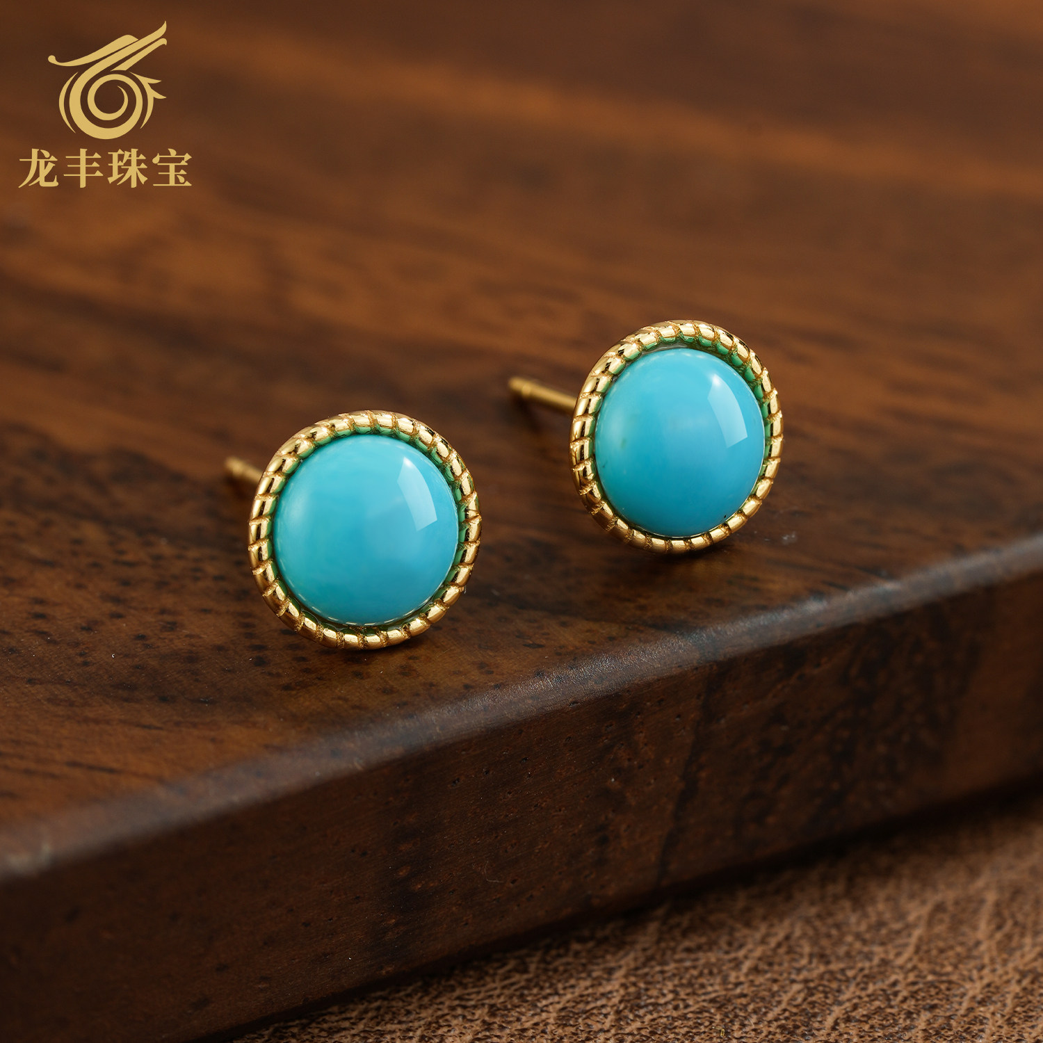 📚 龙丰绿松轩珠宝正品天然绿松石圆形简约耳钉女款银镀18K金耳饰