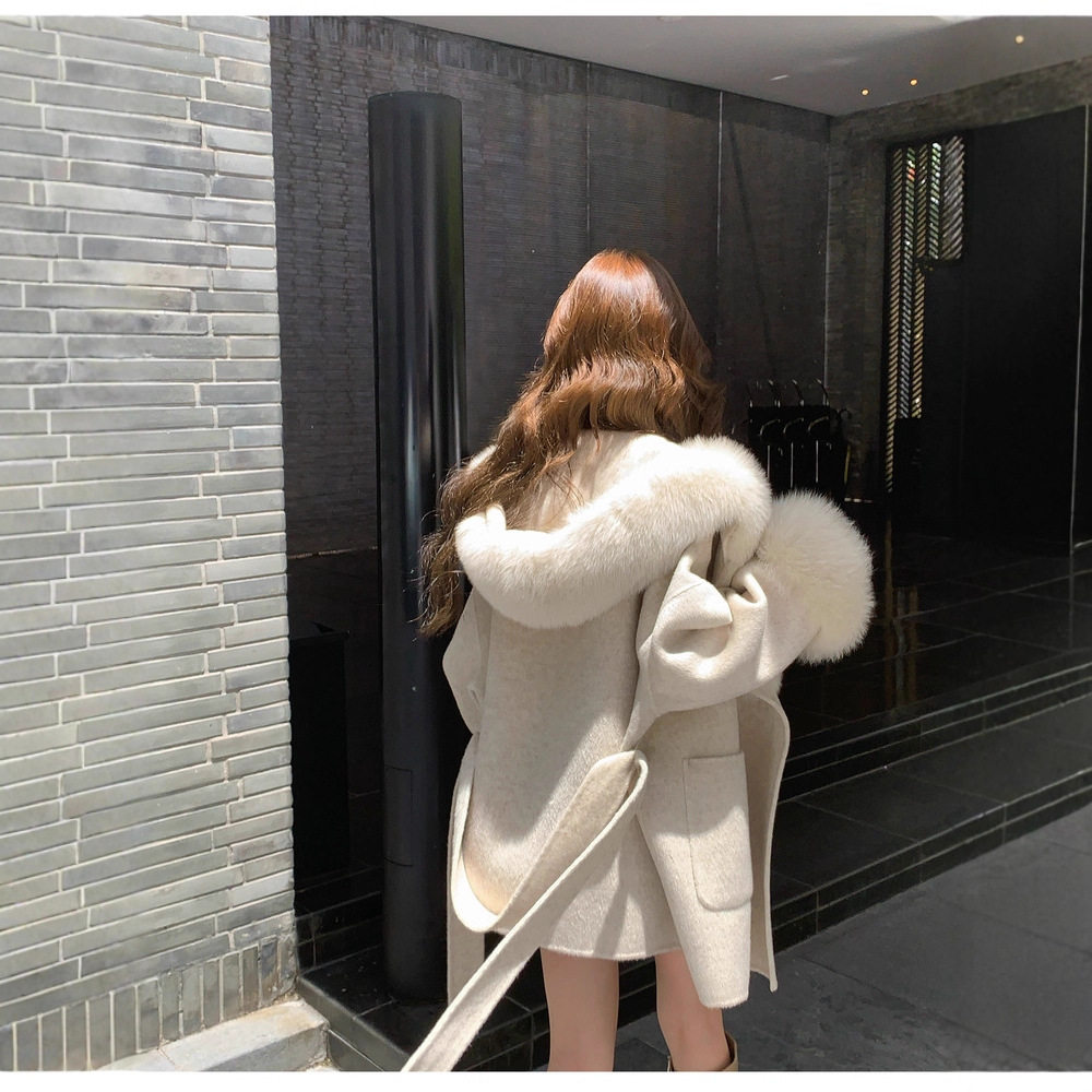 📚 千金2025秋冬新款狐狸毛领连帽双面羊绒大衣女韩版毛呢皮草长外套