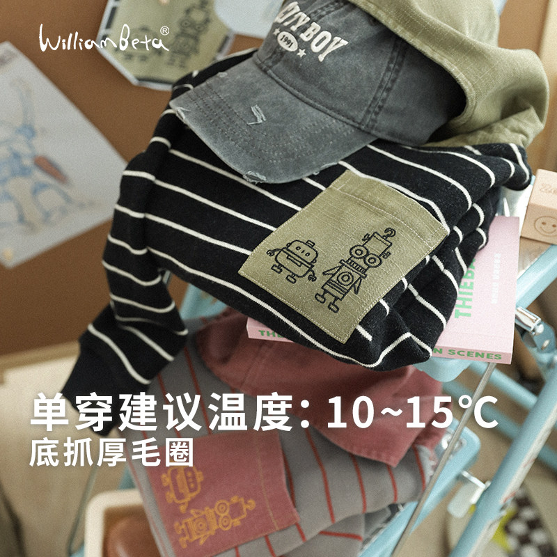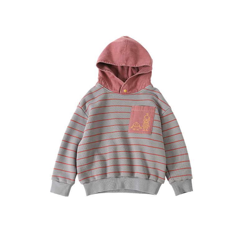 📚 小新贝塔-我爱机器人~冬厚实高磅安可拉红条纹连帽绣花儿童卫衣