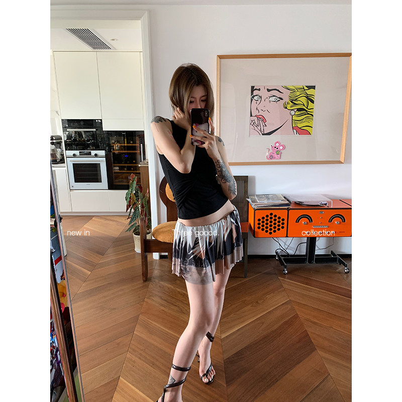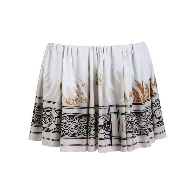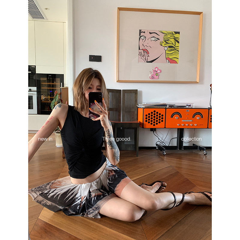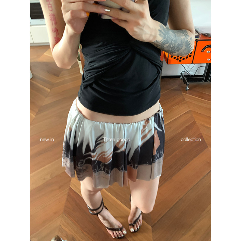 📚 THREE GOOOD殷三吉时装周 牛奶丝下摆不规则印花图案低腰超短半裙
