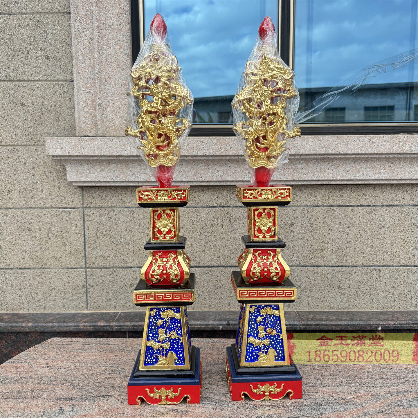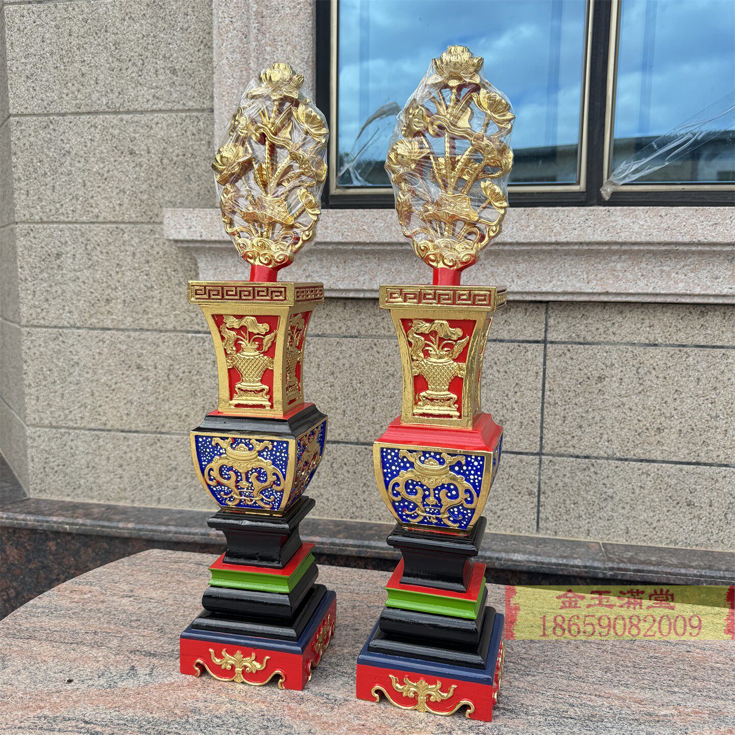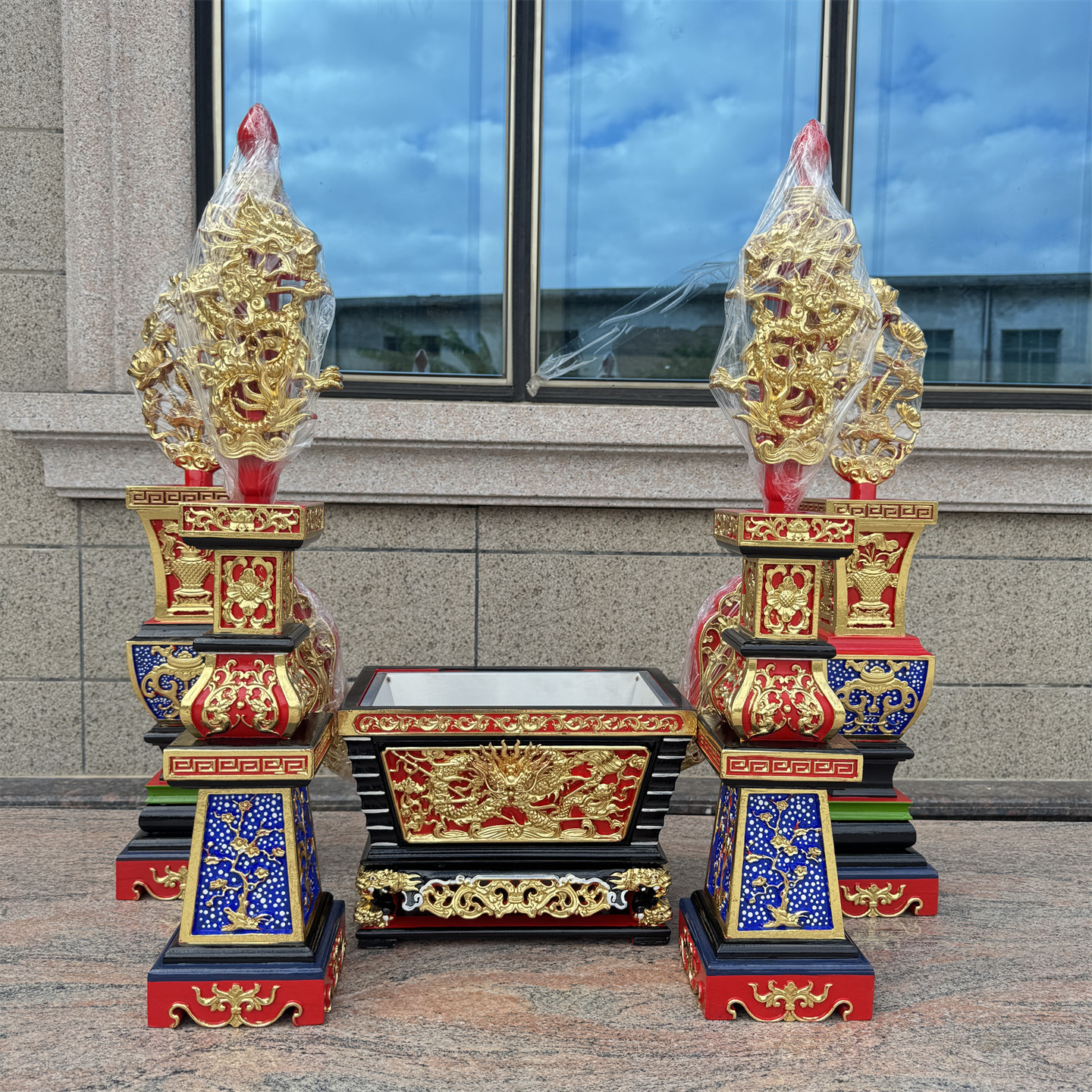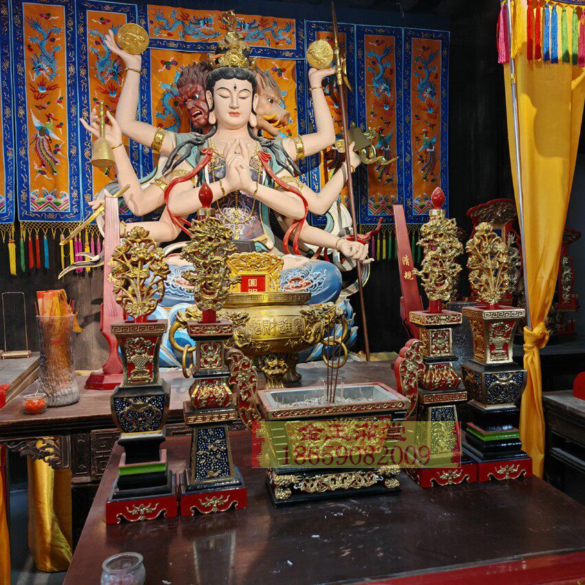 📚 彩色大五供花瓶烛台马槽香炉佛前供奉摆件木雕工艺宴王套川头5供