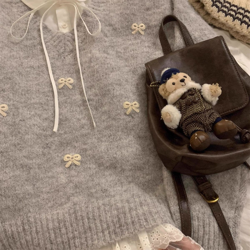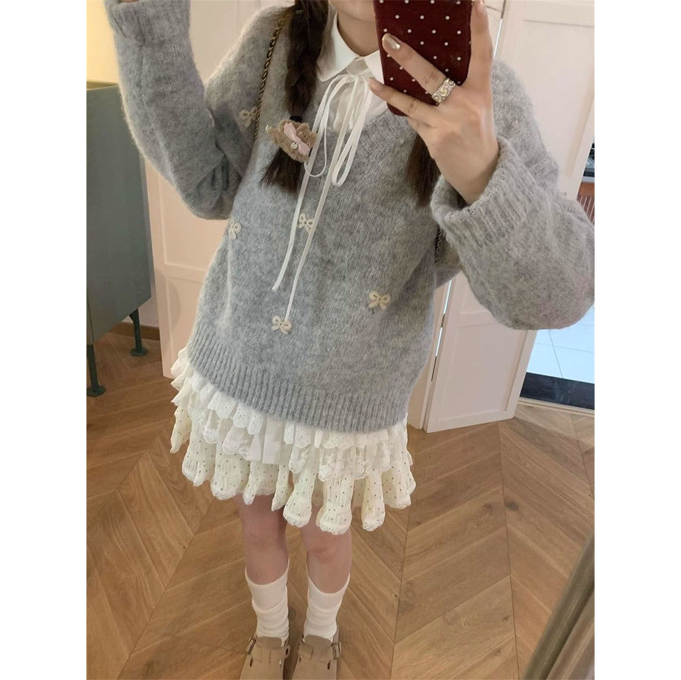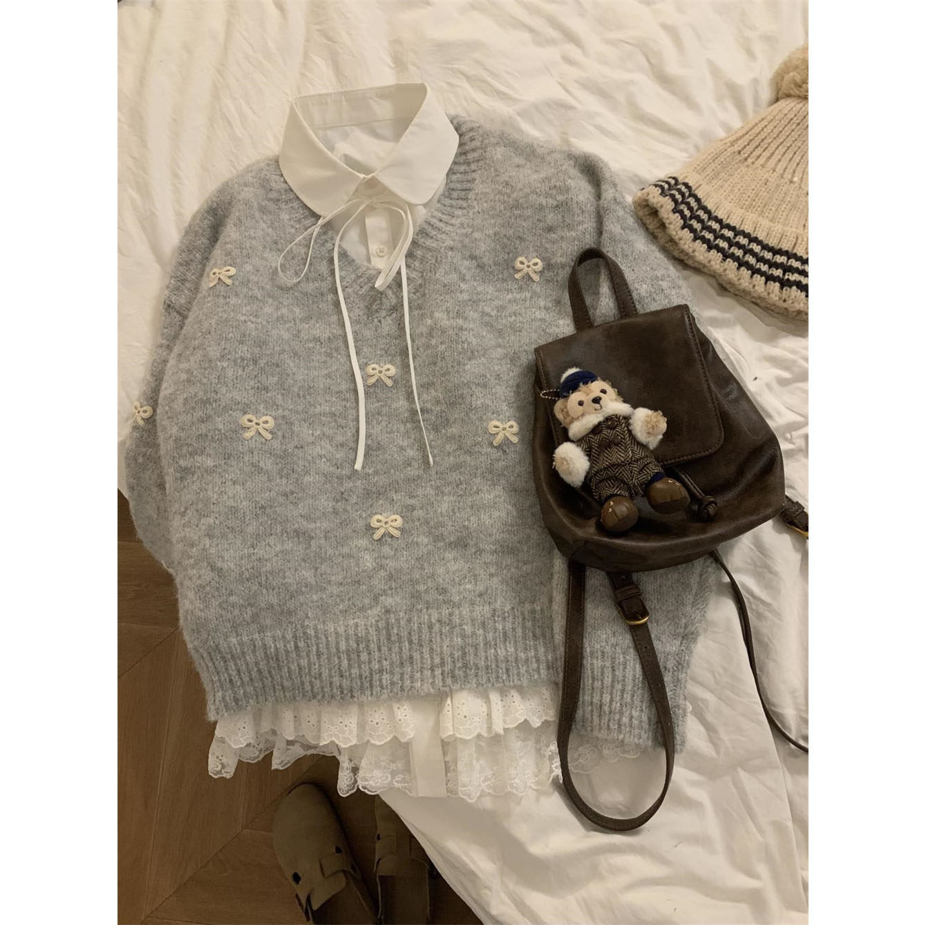 📚 两件套装女秋季学院风甜美软糯蝴蝶结刺绣针织毛衣+蕾丝拼接衬衫
