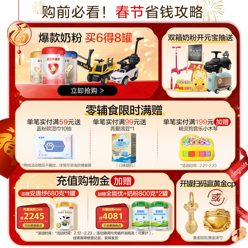 77¥ HU108 GHSiUmXEIib¥ https://m.tb.cn/h.7DlLYtM 【囤奶卡4500g】贝因美红爱666儿童4段奶粉含HMO母乳低聚糖 --------------------- 【原售价】9,999元 【现售价】1,600元。