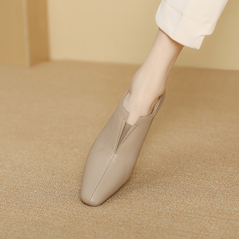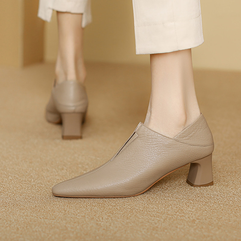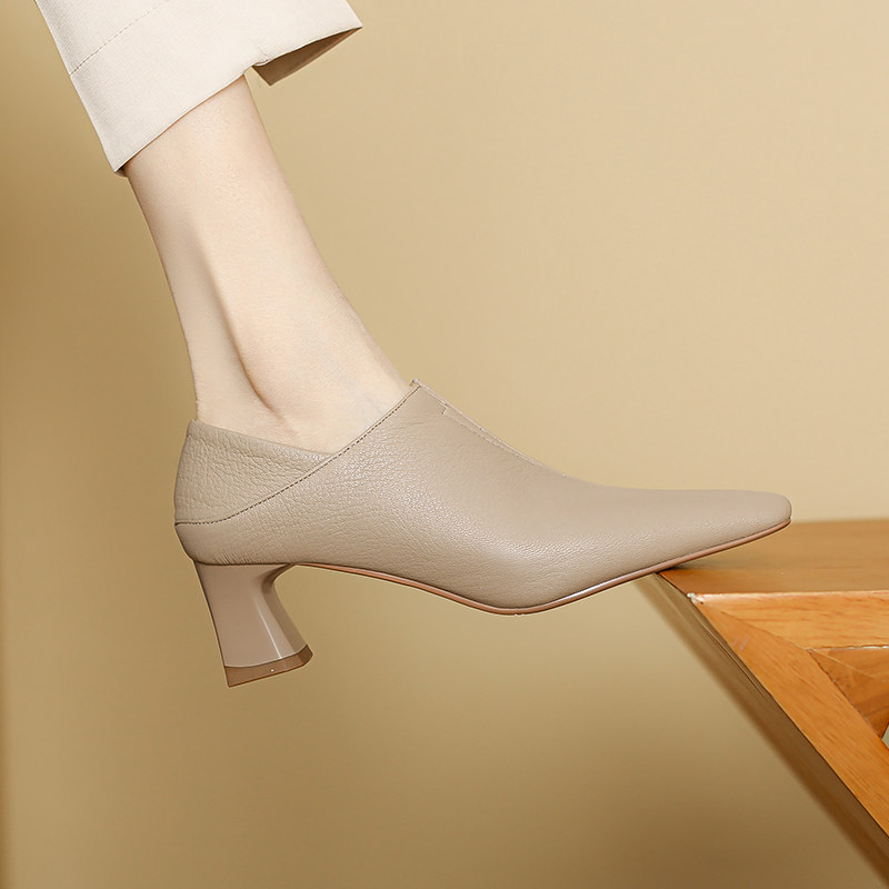 📚 巨软真皮深V口单鞋女方头粗跟早春新款气质百搭半踩懒人高跟鞋5cm
