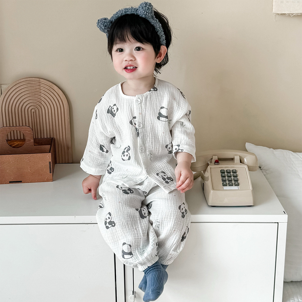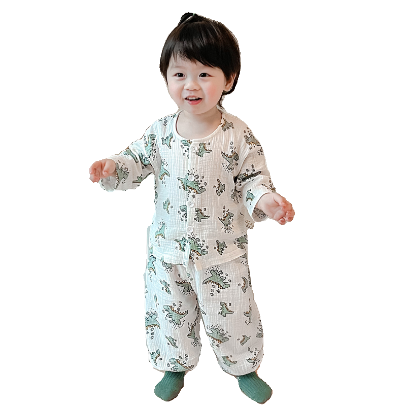 📚 韩国儿童泡泡纱布家居服纯棉春夏款男孩女童网红宽松洋气睡衣套装