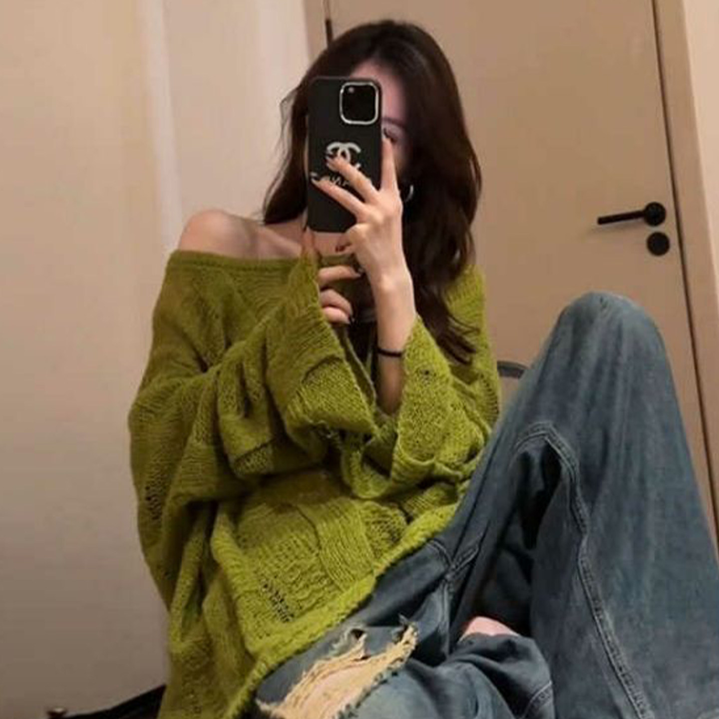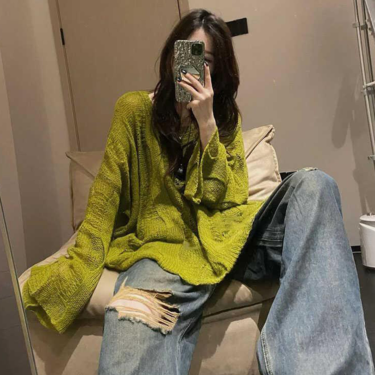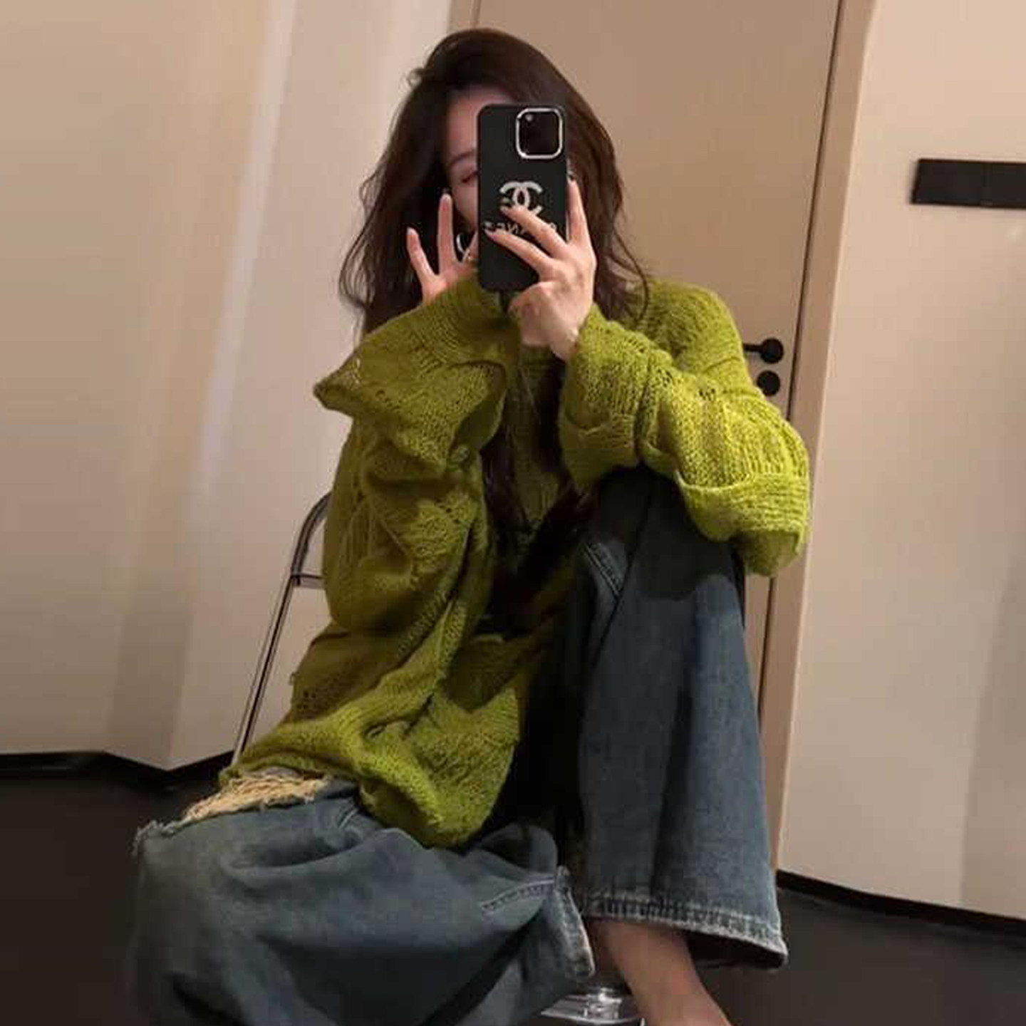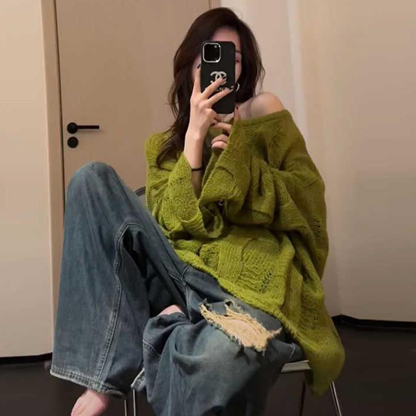 📚 300斤特大码绿色镂空设计感长袖毛衣女胖mm简约慵懒风针织衫上衣