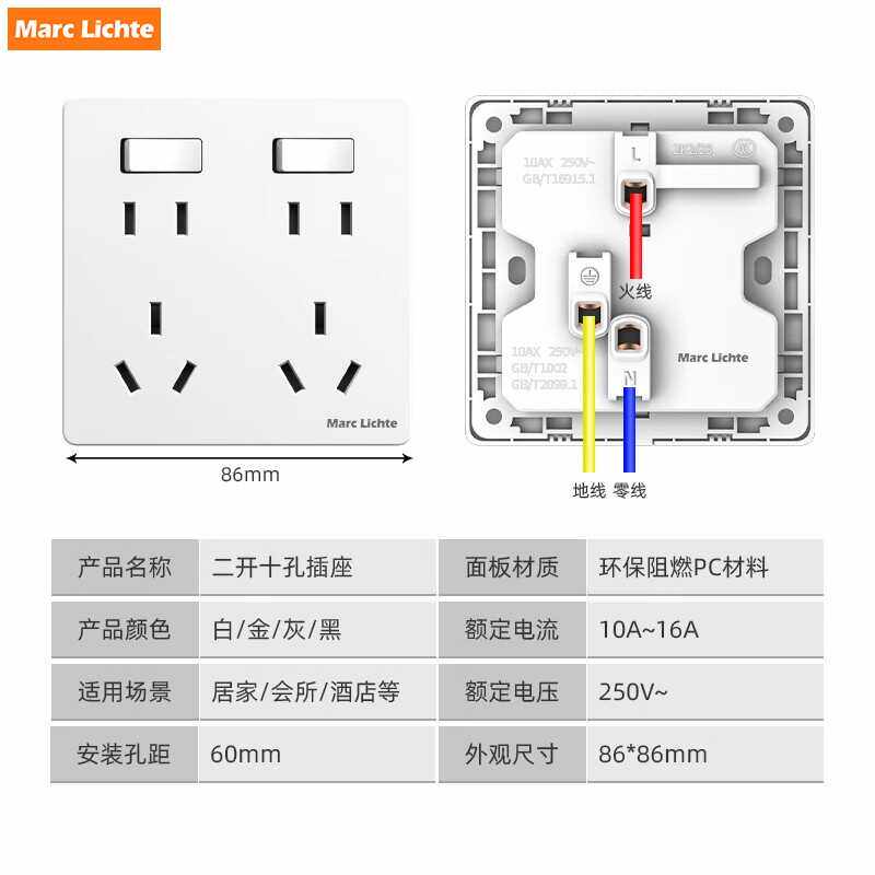 📚 二开十孔面板厨房10A双五孔六孔插座86型10孔插座带开关独立控制