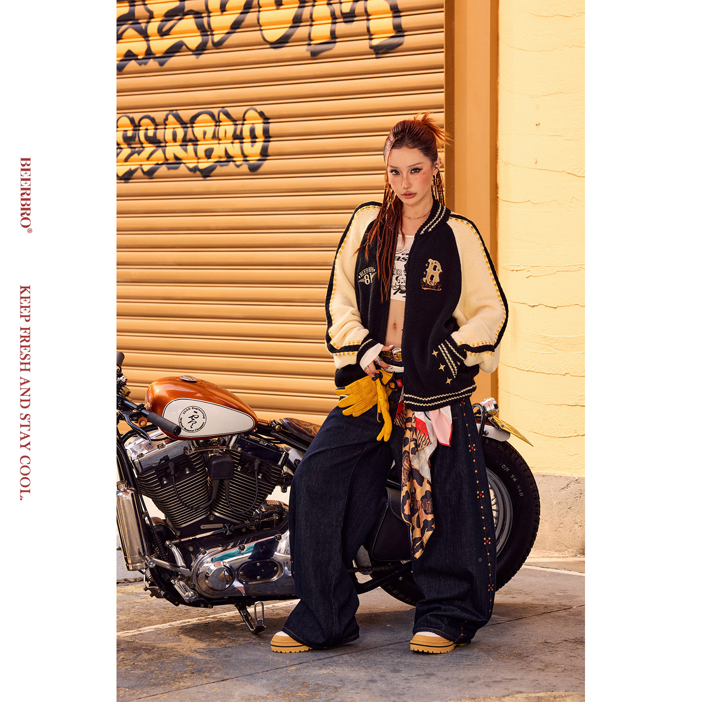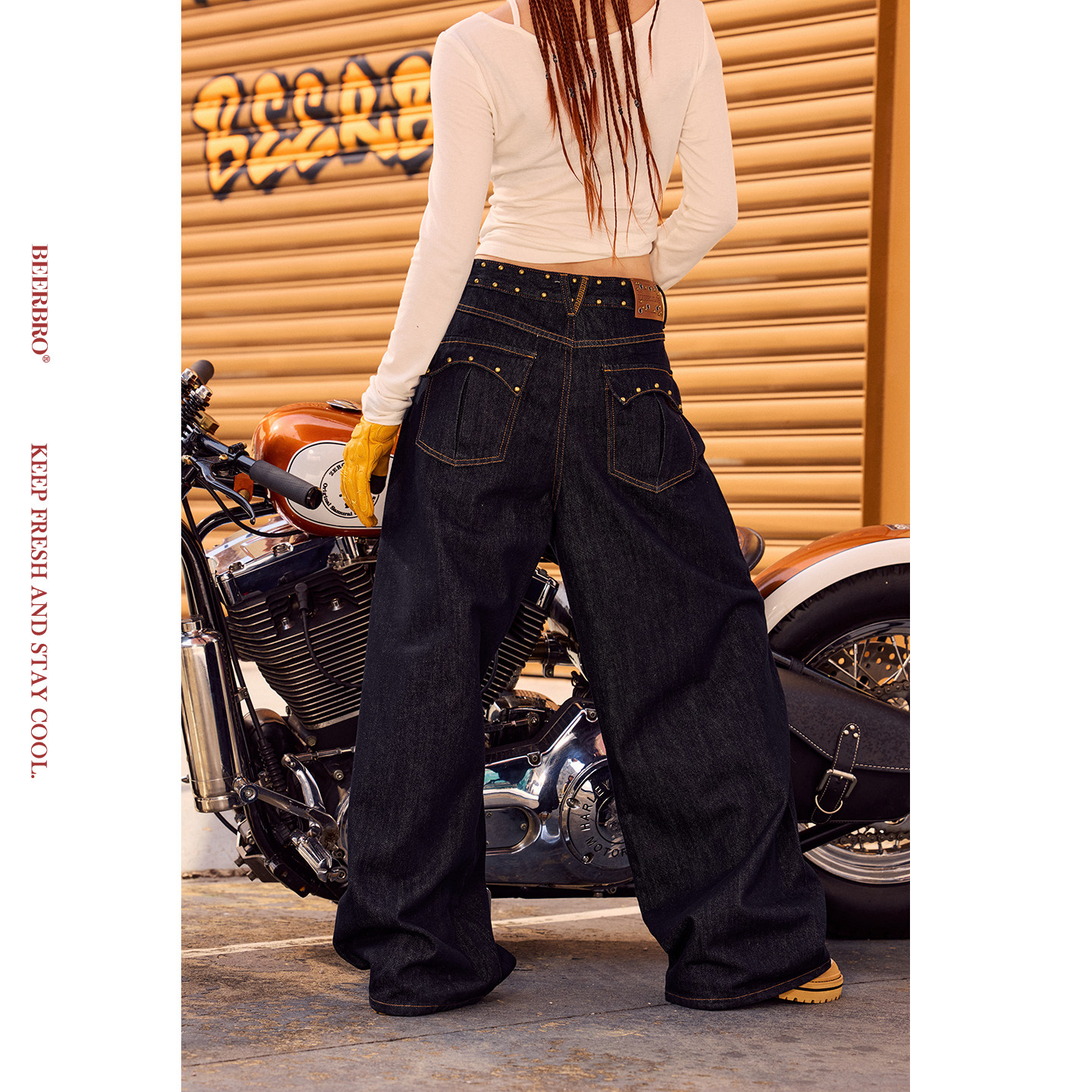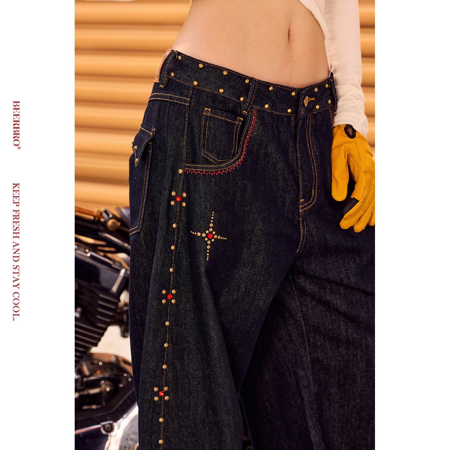 📚 BeerBro『CITY MOTO』原牛色秋冬侧缝烫铜片装饰阔腿弯刀牛仔裤