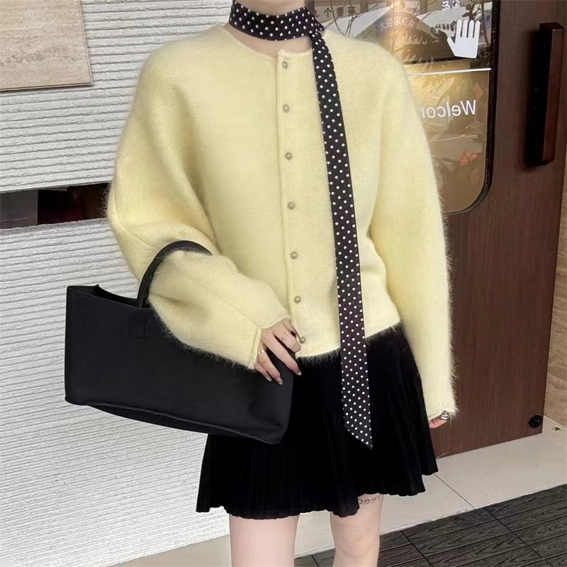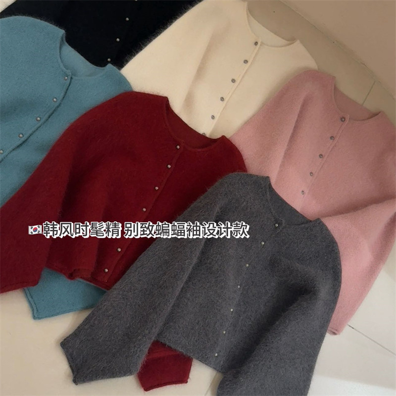 📚 韩系时髦别致蝙蝠袖设计感圆领单排扣羊绒蜜熊开衫女时尚毛衣外套