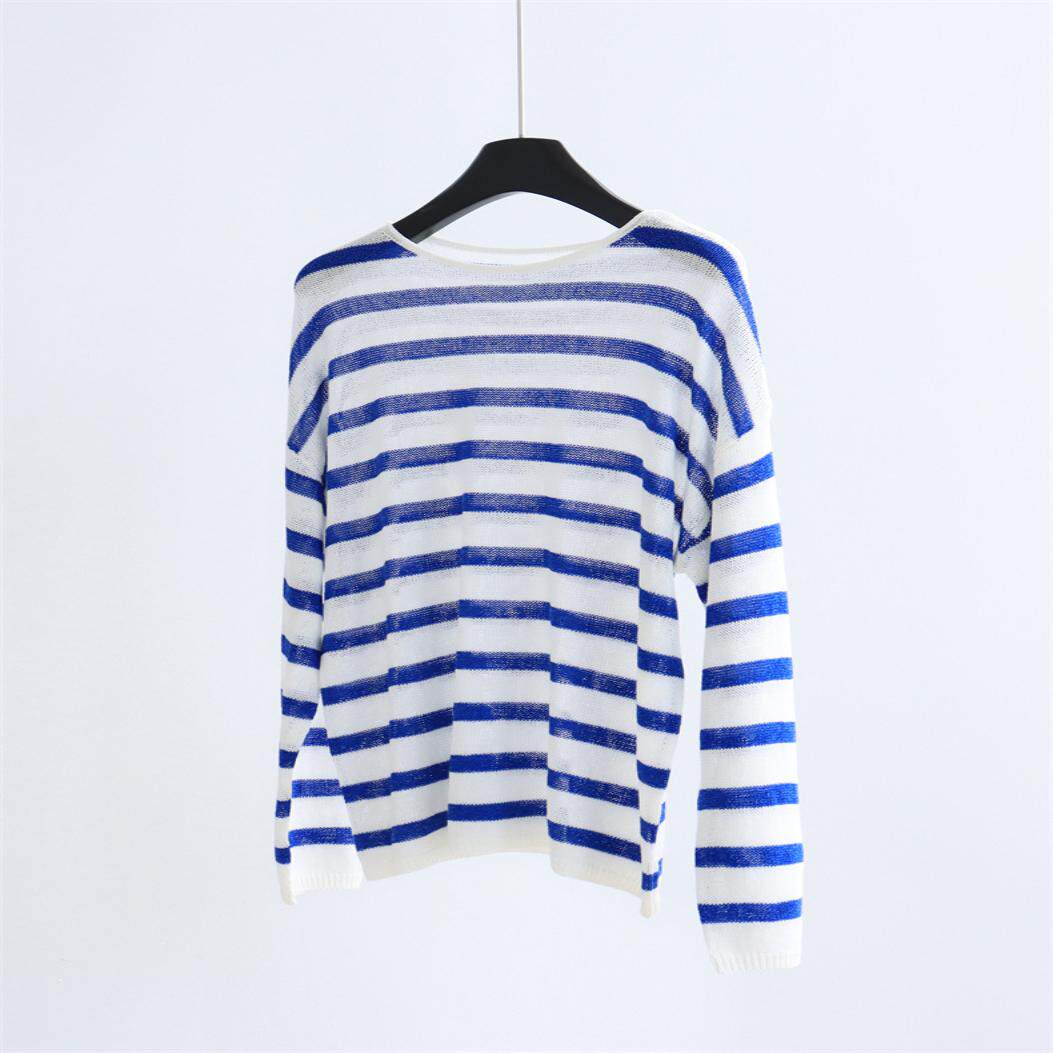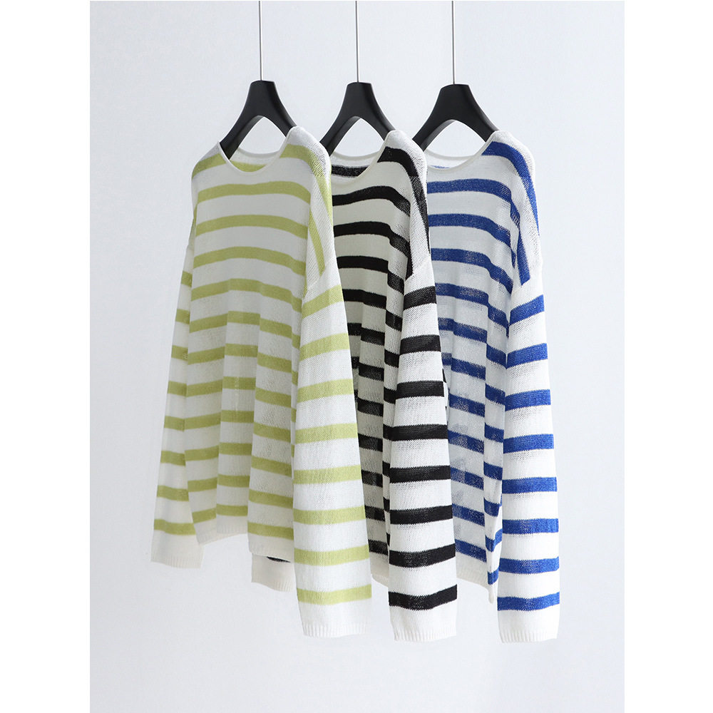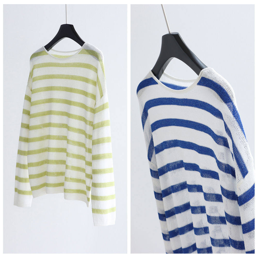 📚 条纹控进口和纸纱针织衫长袖夏季薄款防晒罩衫随意卷边套头上衣女