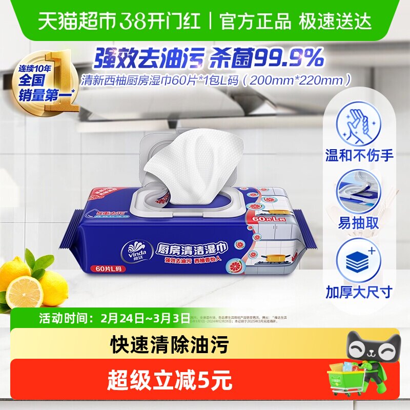 📚 包邮维达厨房专用湿纸巾湿巾单包尝鲜L码20倍去油污安心卫生纸巾
