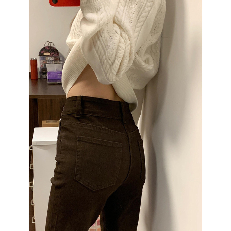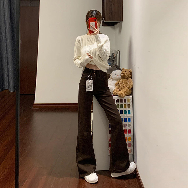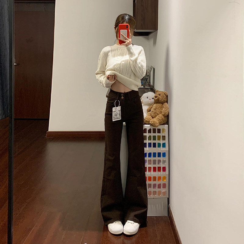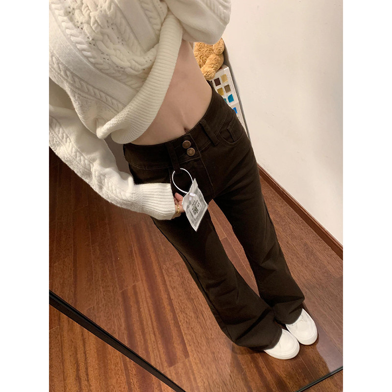 📚 咖色双扣微喇叭牛仔裤女2025秋冬加绒高腰宽松弹力修身显瘦马蹄裤