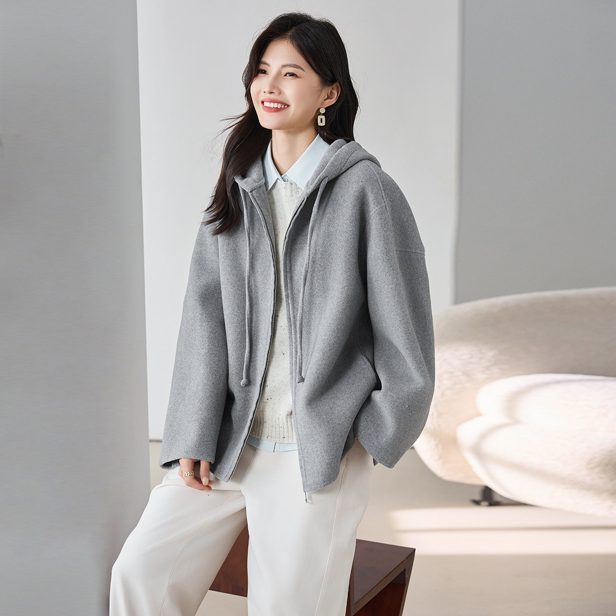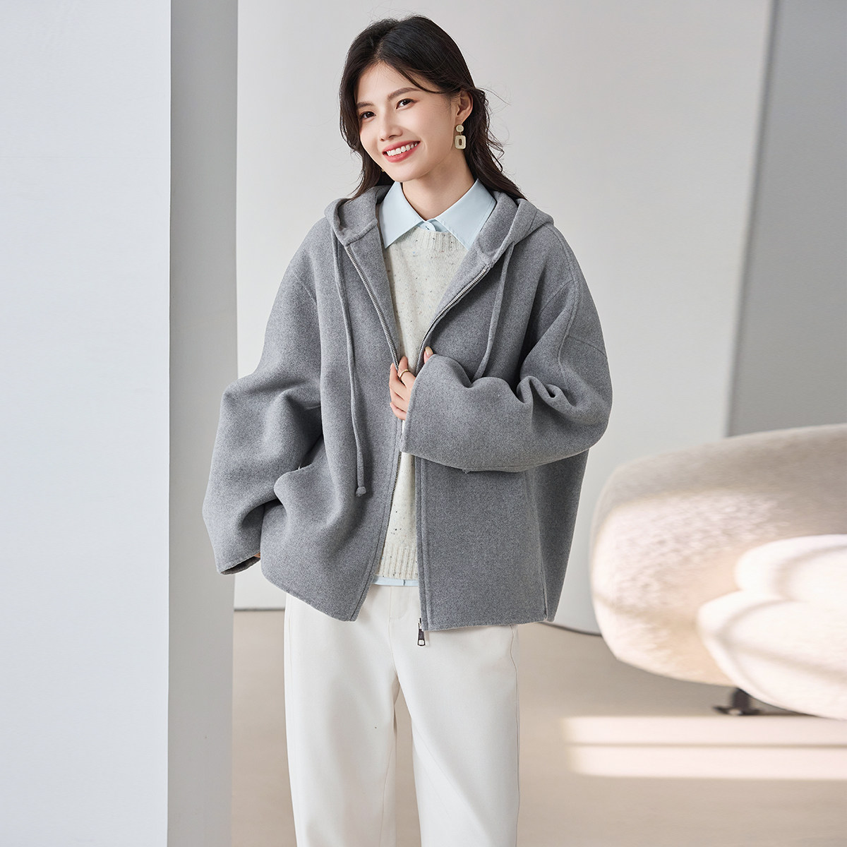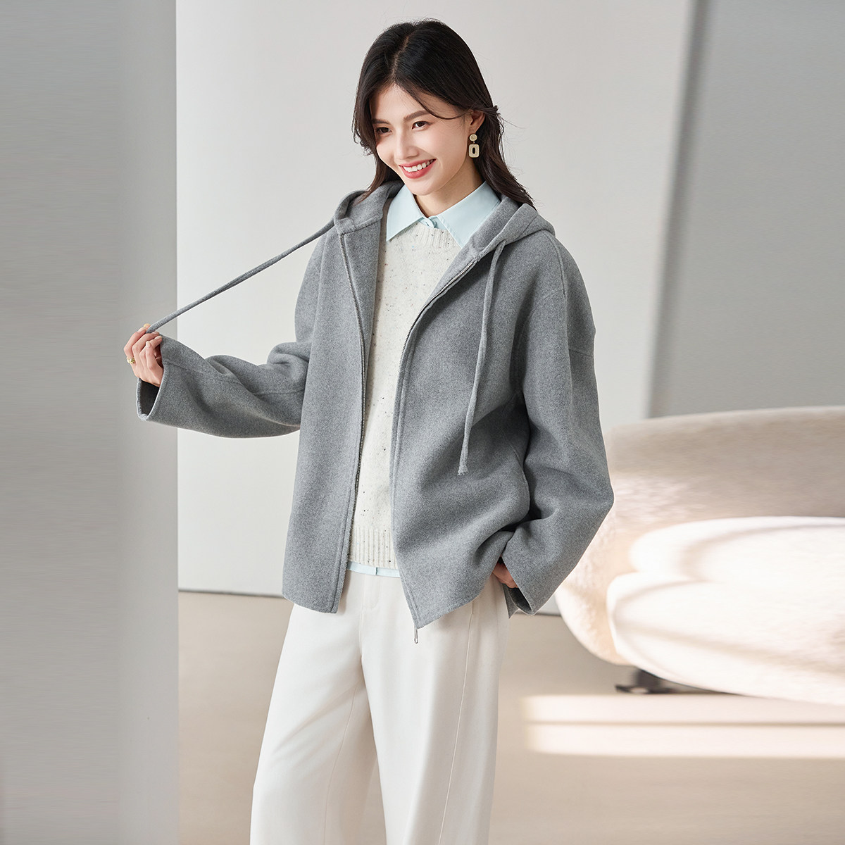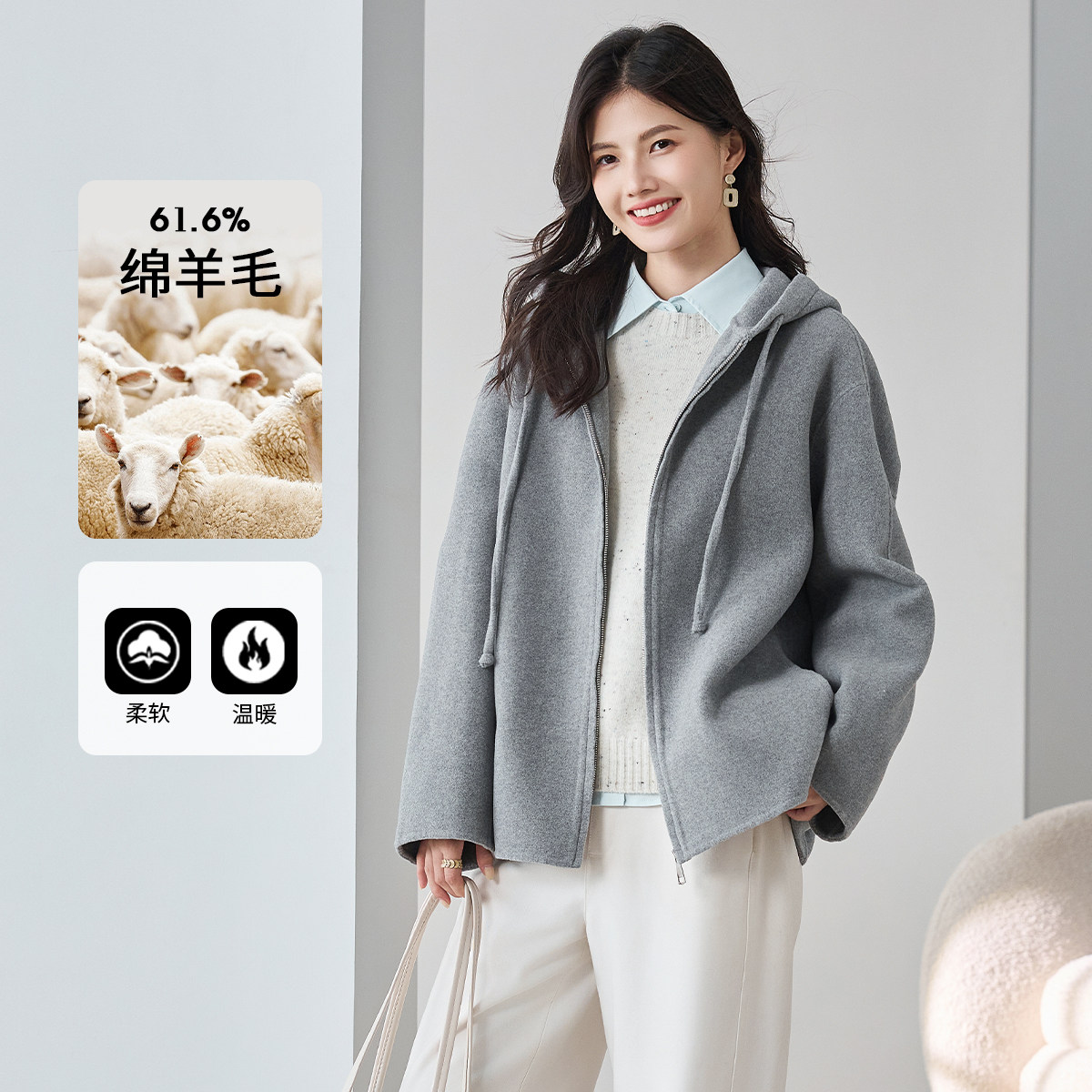 📚 3S女装2025冬极简风绵羊毛连帽短款毛呢外套女抽绳保暖大衣