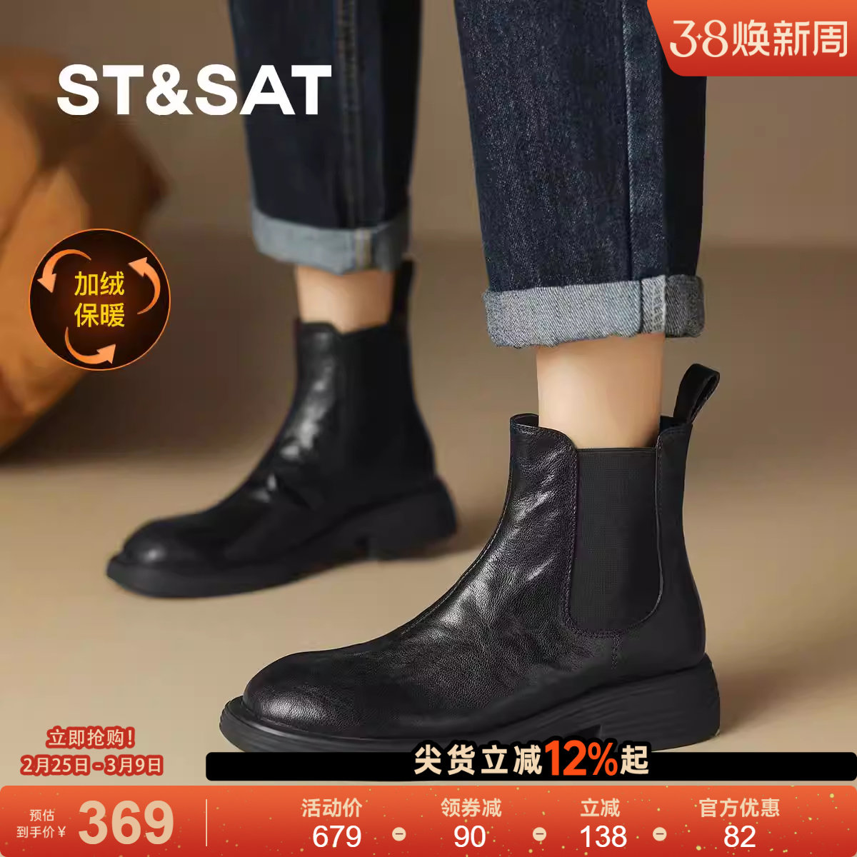 📚 星期六羊皮加绒英伦马丁靴25年秋冬圆头切尔西厚底短靴女舒适女鞋