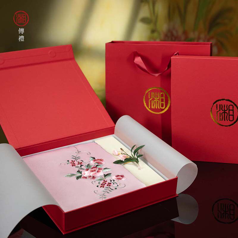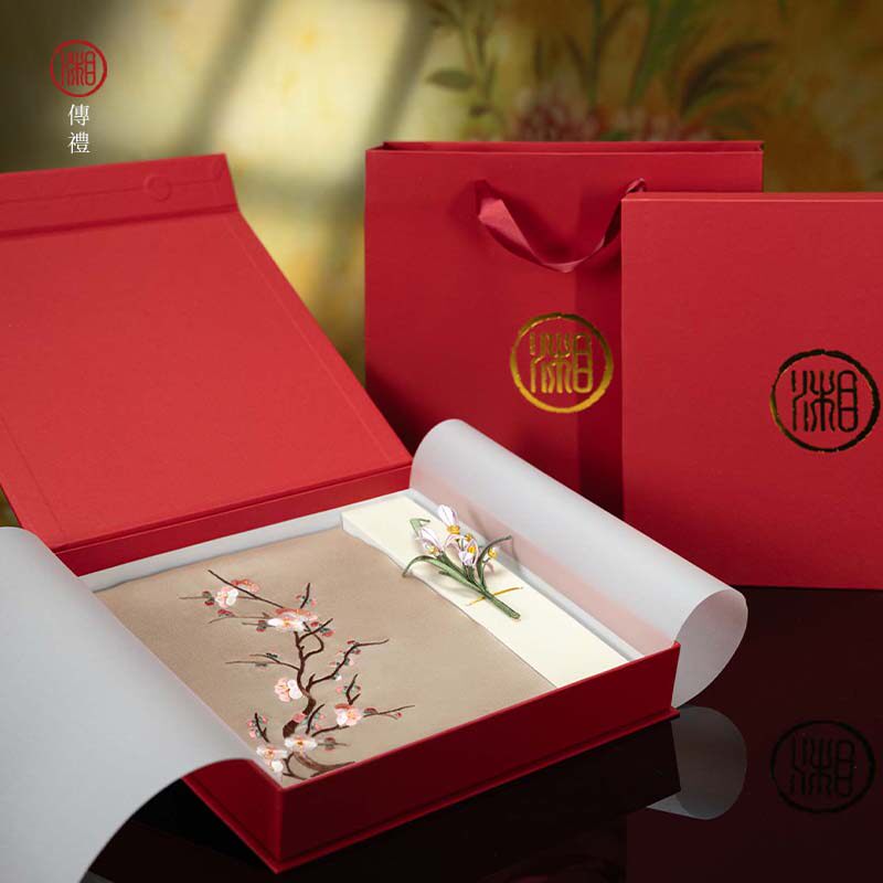 📚 湘传礼湘绣纯手工刺绣双层真丝围巾搭配手工发簪/胸针家居礼套盒