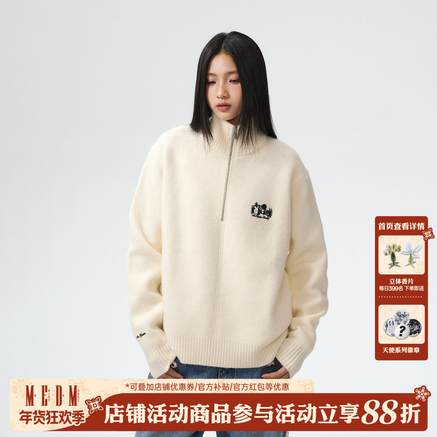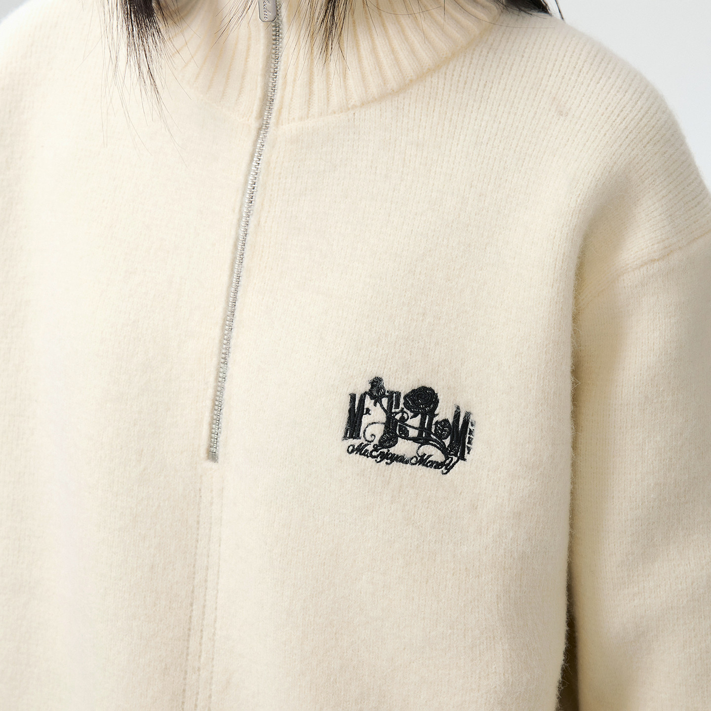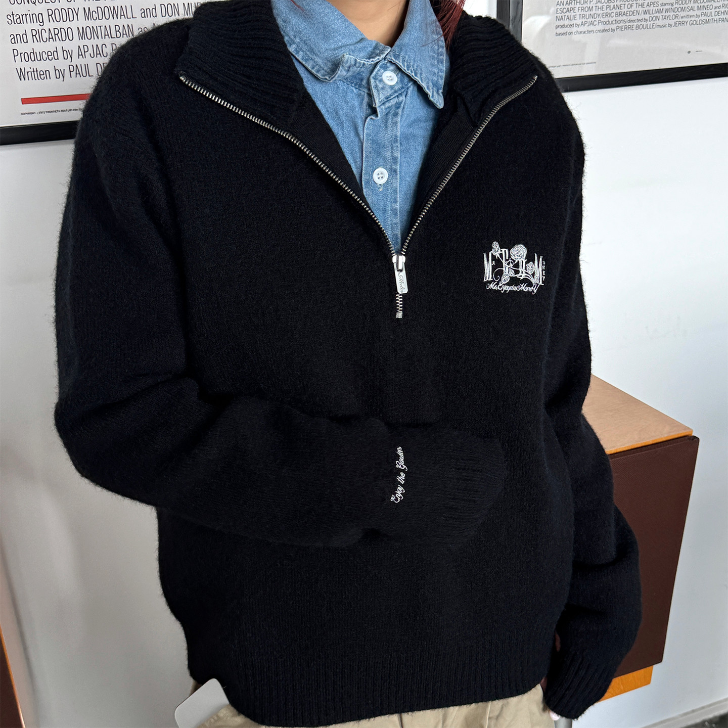 📚 MEDM 黑白玫瑰花刺绣半拉链高领毛衣秋冬美式保暖内搭休闲针织衫