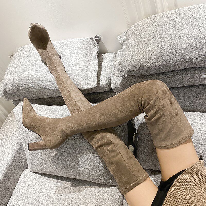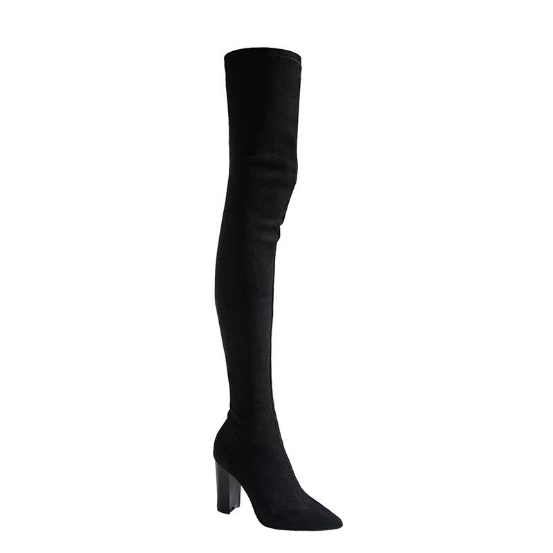 📚 长筒靴女小个子超长过膝靴尖头绒面粗跟弹力瘦瘦靴高跟长统靴黑色