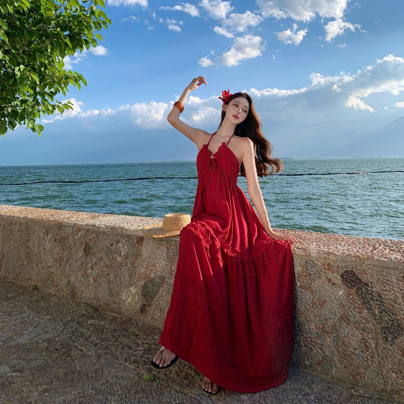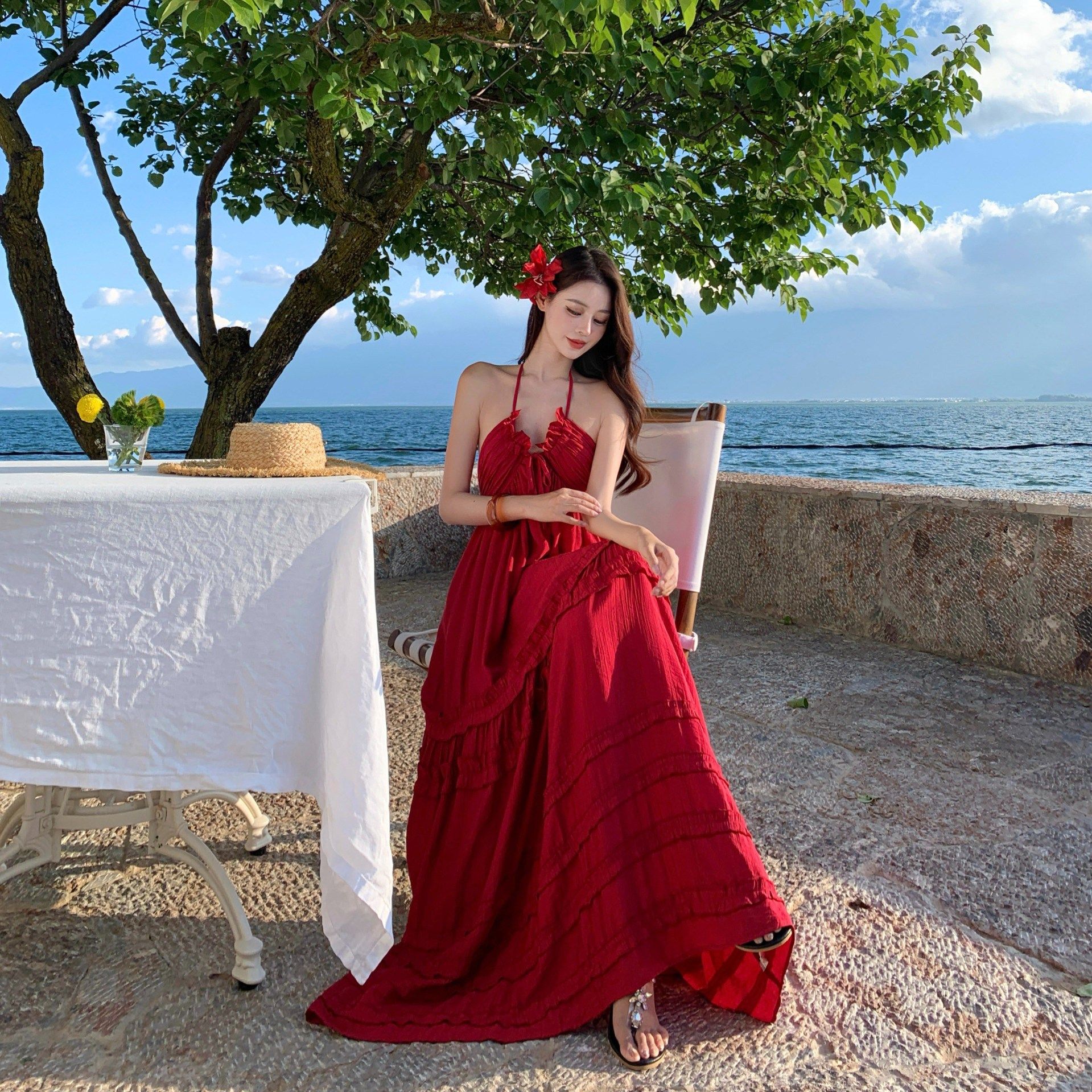 📚 泰兰德海边度假氛围感挂脖吊带连衣裙女法式重工性感露背蛋糕纯欲