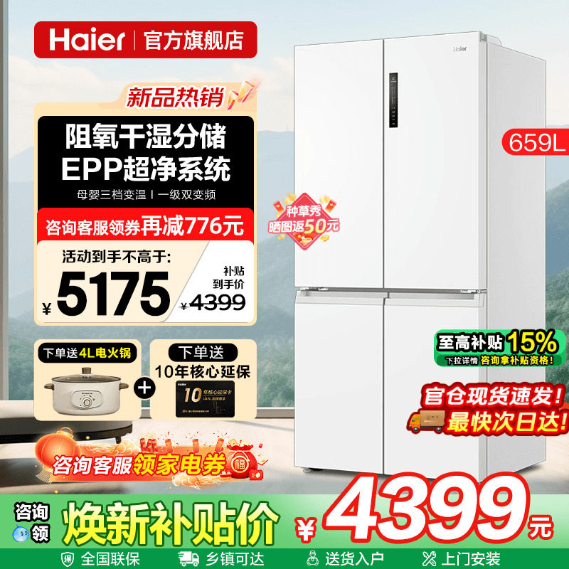 📚 海尔冰箱659L白色大容量一级能效十字四门双开家用风冷无霜旗舰店
