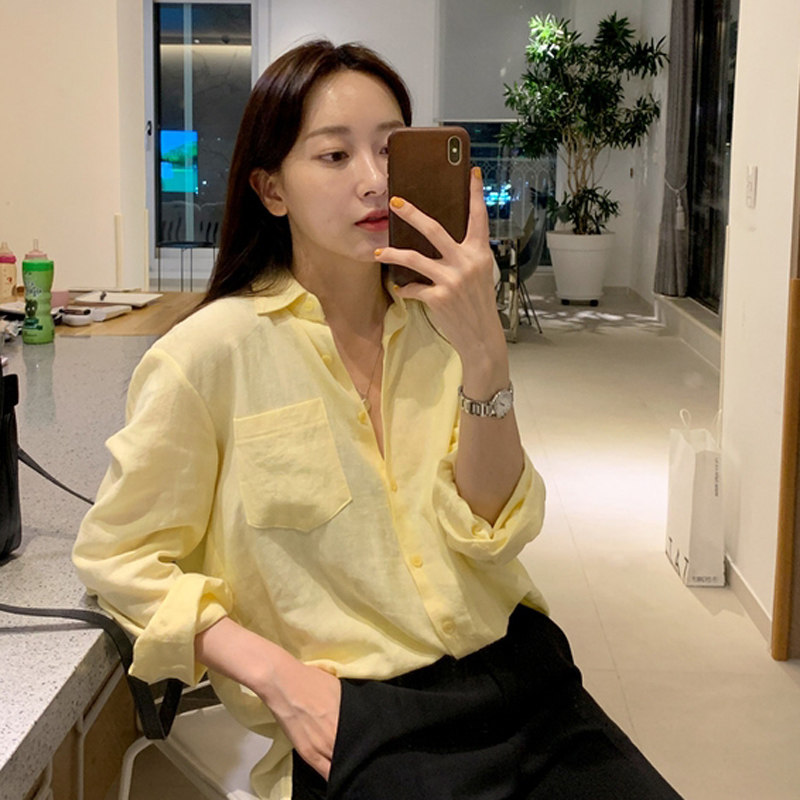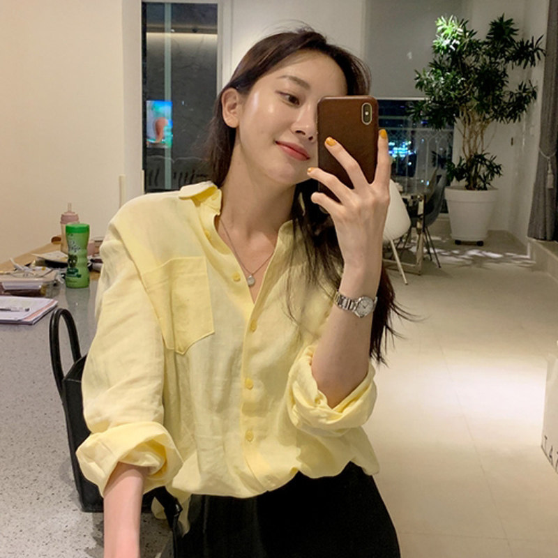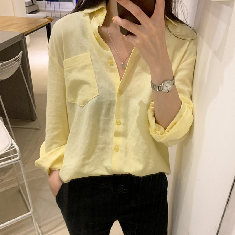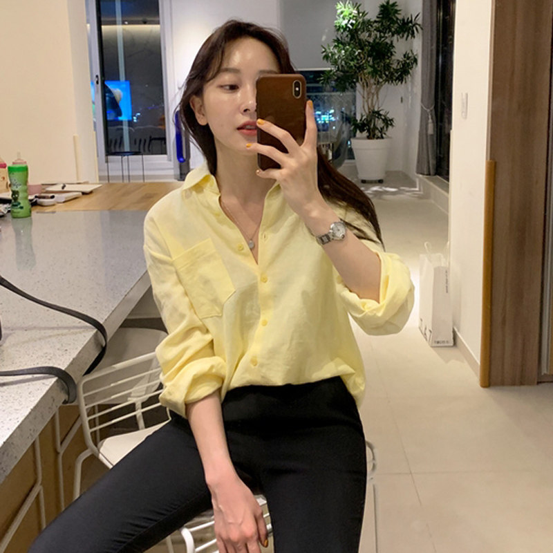 📚 春秋新款衬衫女浅淡黄显瘦洋气柠檬黄长袖女衬衣上衣鹅黄色打底衫