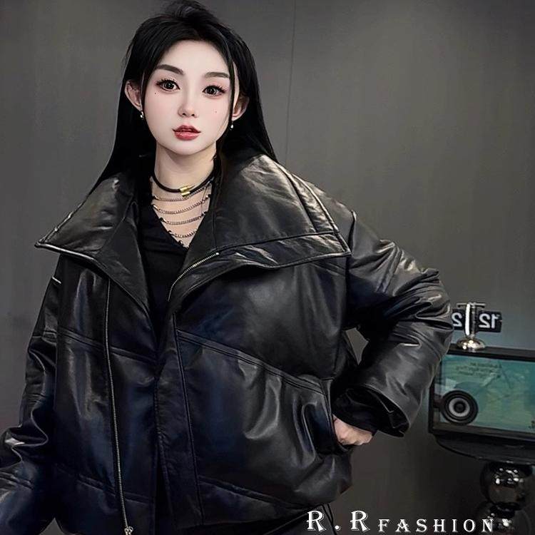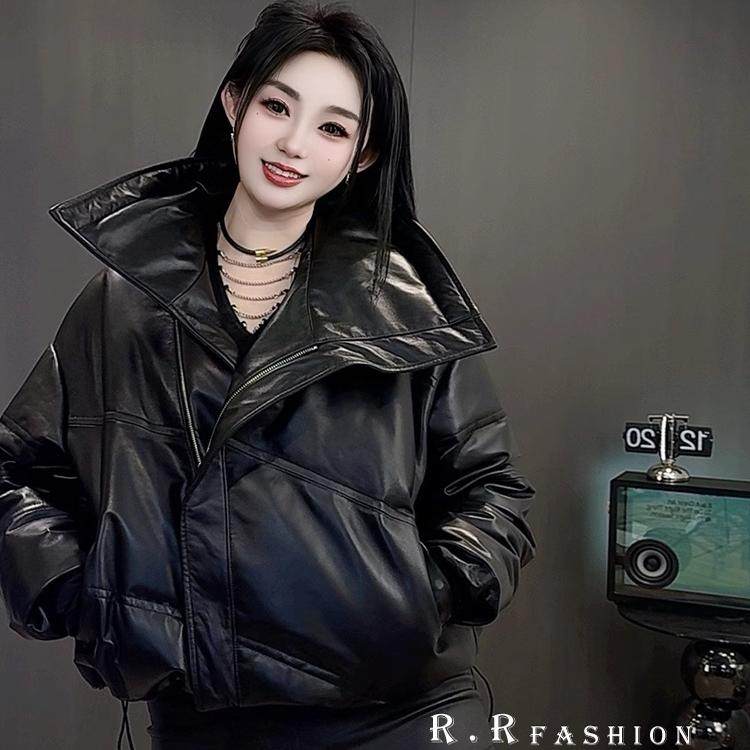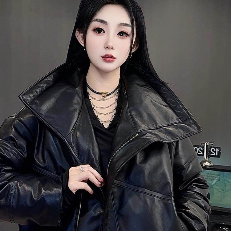 📚 【现货】抽绳收腰绵羊皮皮衣纯色长袖翻领皮羽绒女2025秋冬新款