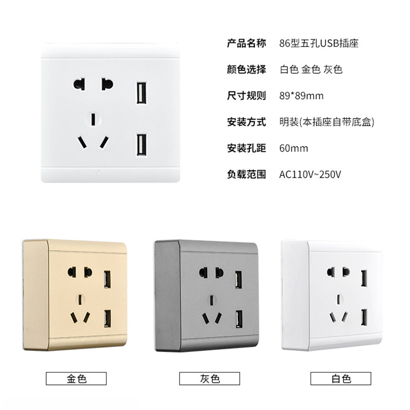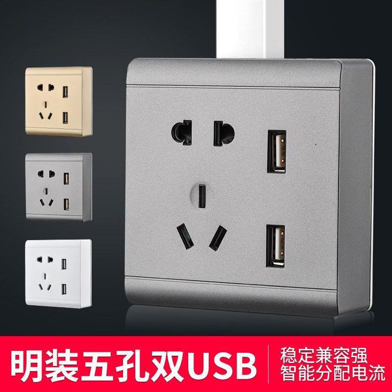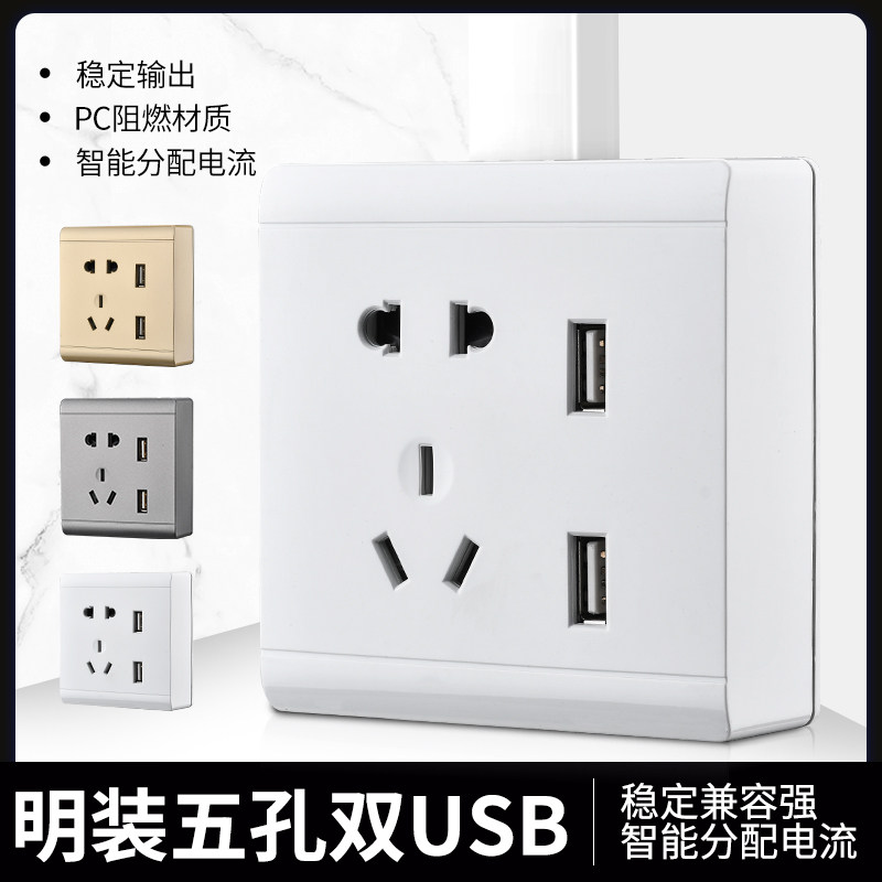 📚 明装五孔带双USB插座面板二三插多孔明线盒一体两位usb手机充电口
