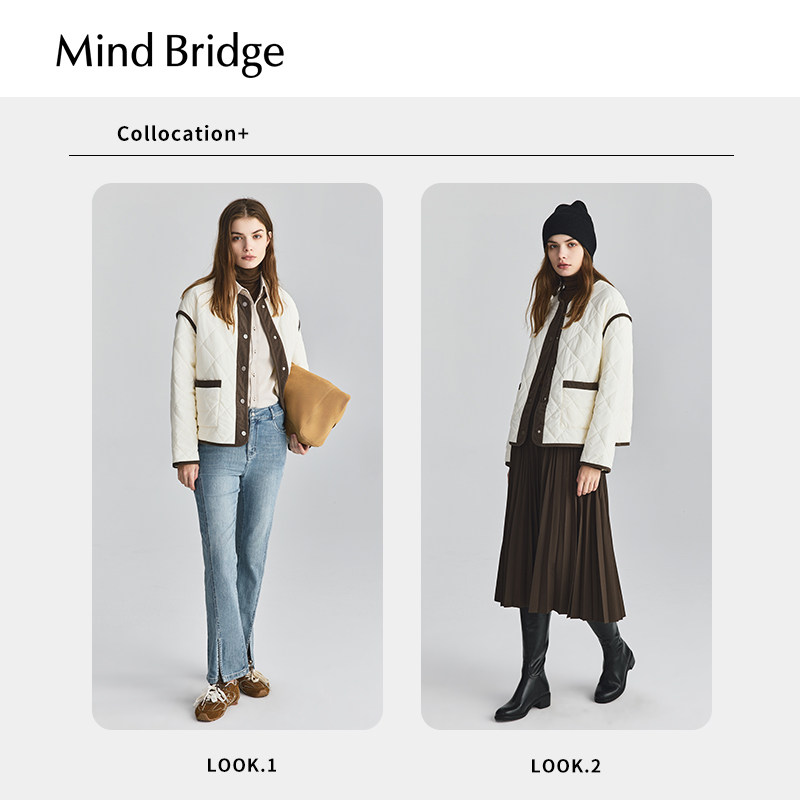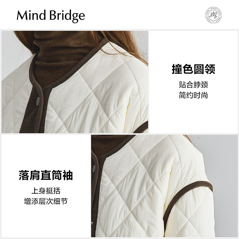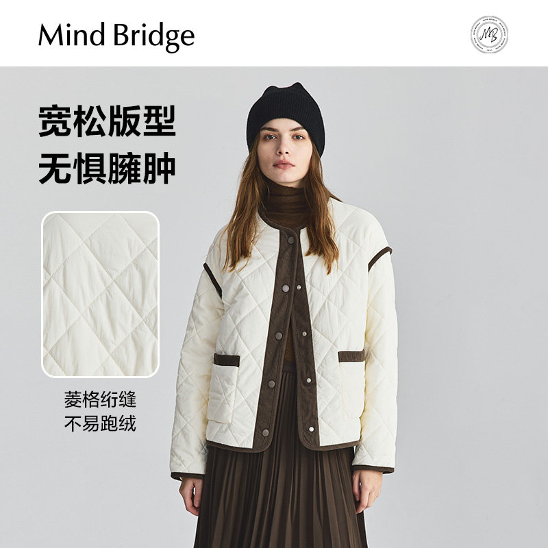 📚 MindBridge女士圆领撞色菱格羽绒服2025年宽松保暖冬季加厚外套