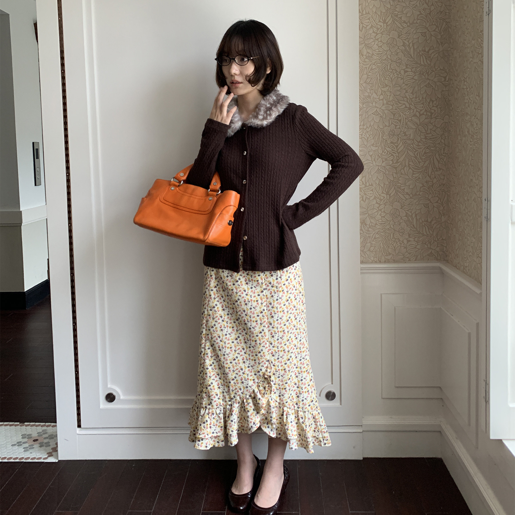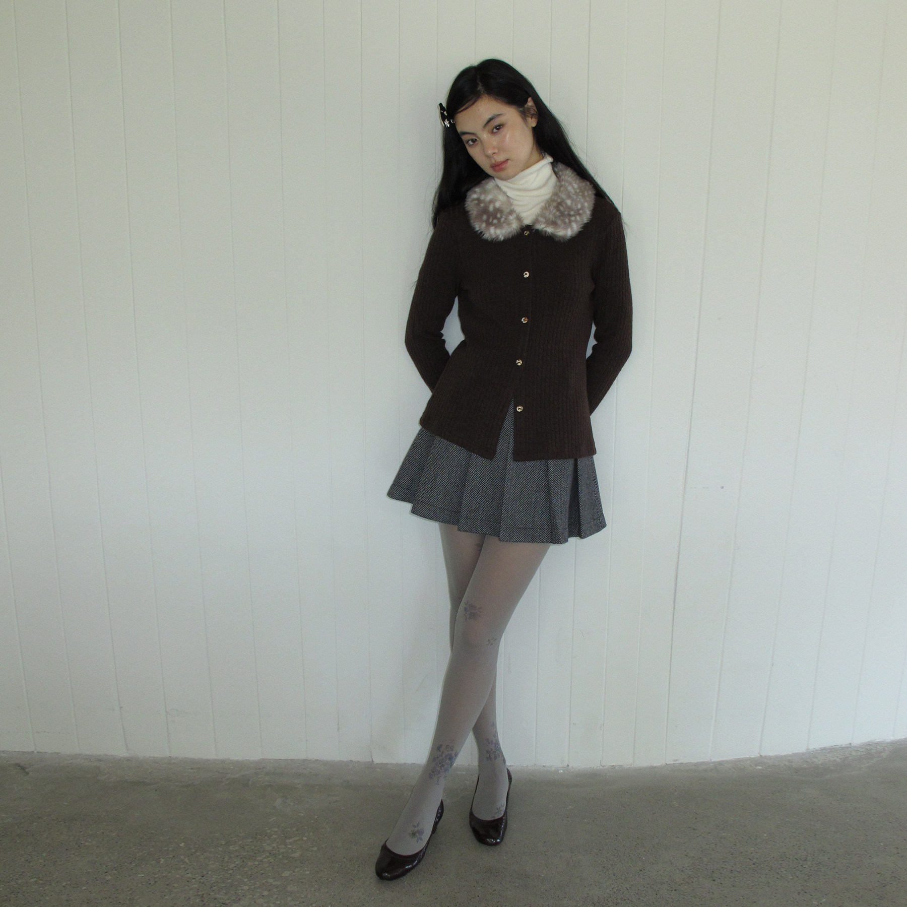📚 花筏NOTJUSTHIM《绒栗》灰咖色小鹿斑点毛领绞花针织开衫外套