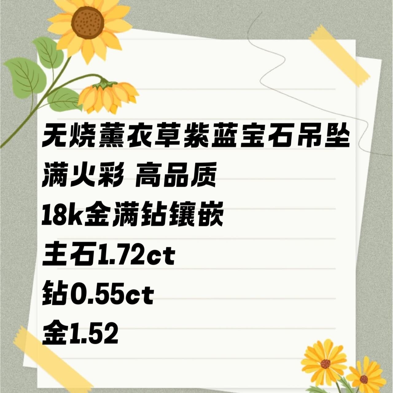 📚 天然薰衣草紫蓝宝石吊坠1.7克拉 金重1.5g 18k金满钻镶嵌