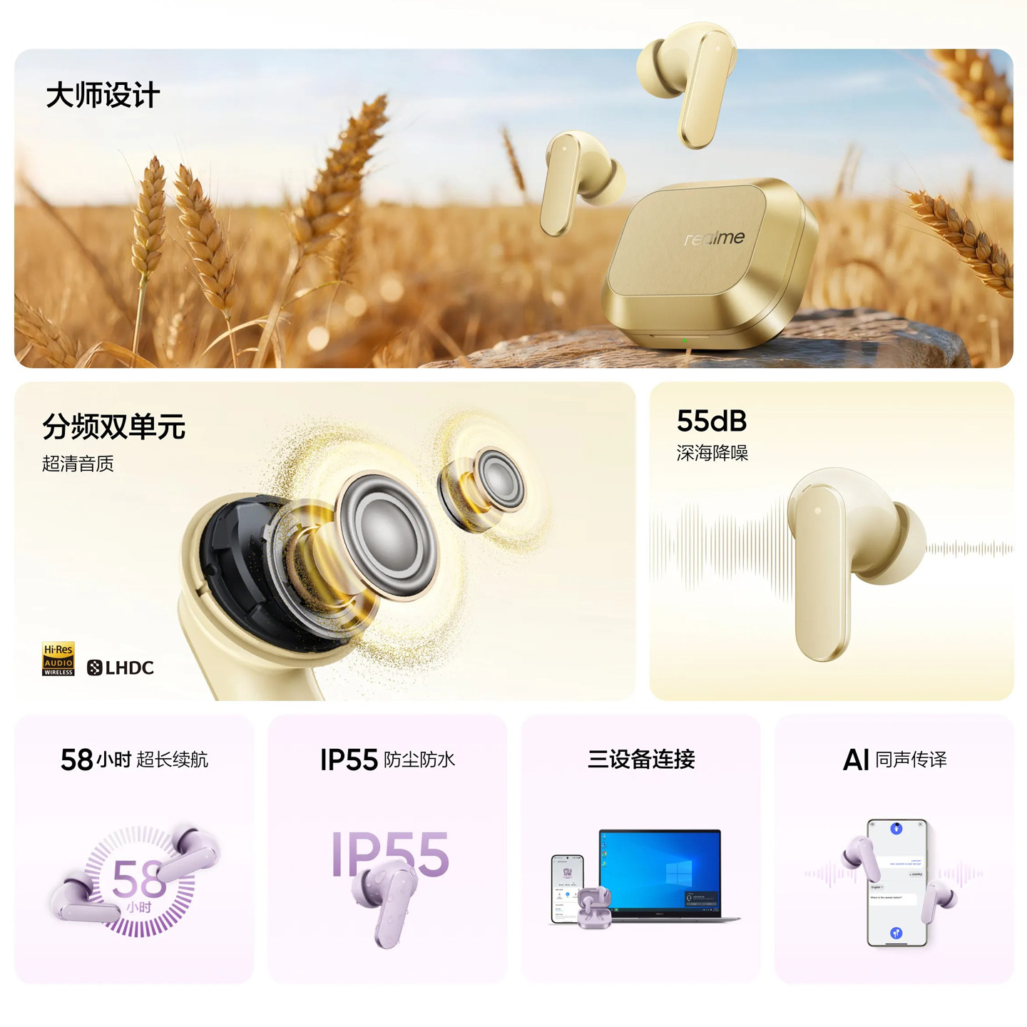 📚 realme真我Buds Air8蓝牙耳机55dB降噪分频双单元LHDC真我air8