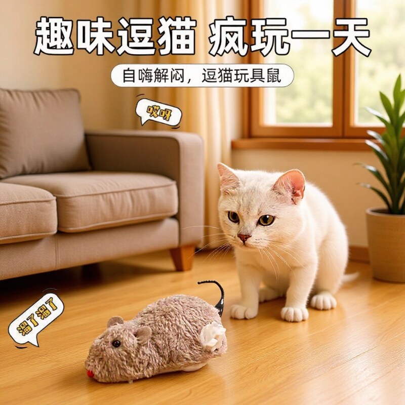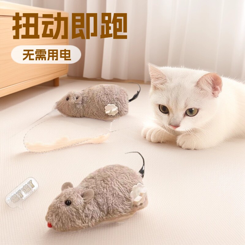 📚 猫玩具自嗨解闷仿真毛绒老鼠发条玩具上链会跑可爱逗猫咪狗狗玩具
