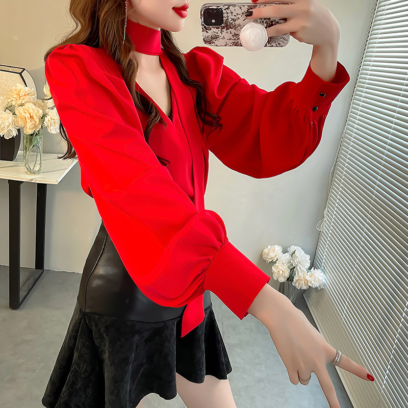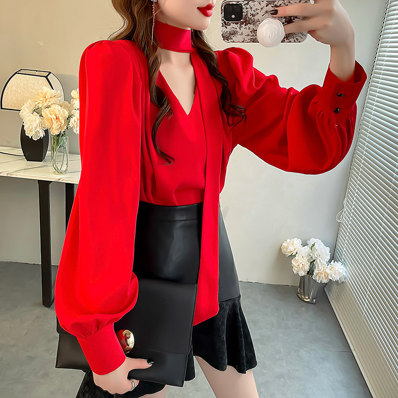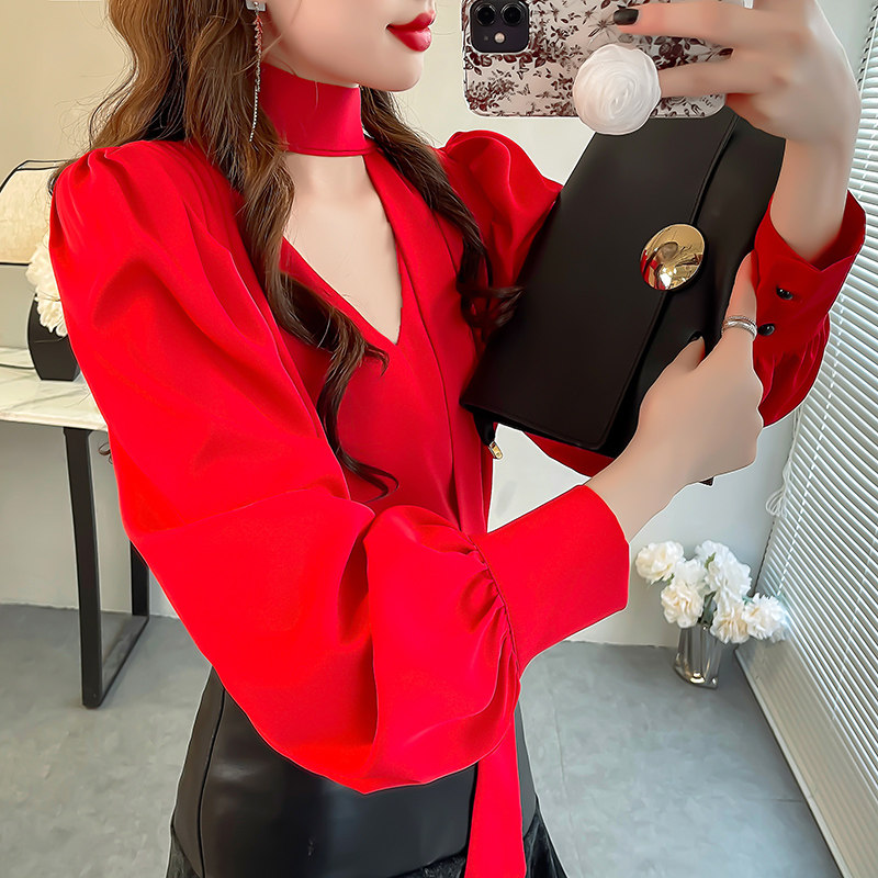 📚 红色显白雪纺衬衫女设计感小众纯色衬衣显瘦飘带V领泡泡袖上衣秋