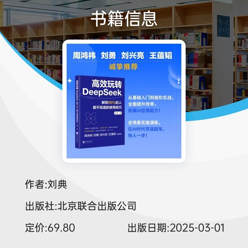 57¥ HU926 nQq65R9cnh9¥ https://m.tb.cn/h.iI31uww 高效玩转DeepSeek从基础入门到高阶实战全面推展提升自身AI实力从身份上来说比秋叶李尚龙 更为专业周宏伟推荐人工智能操作指南书 --------------------- 【原售价】29.9元 【现售价】12.8元。