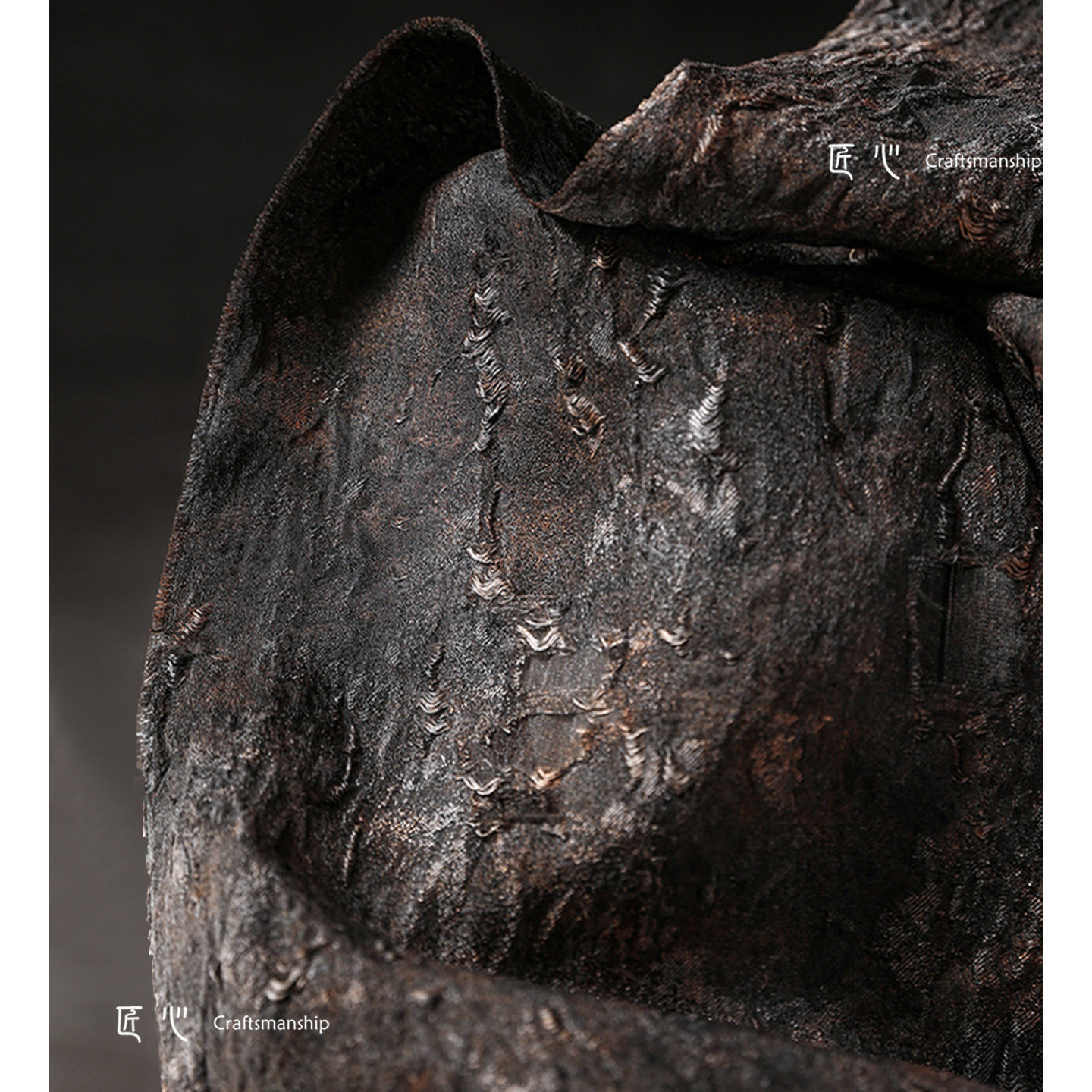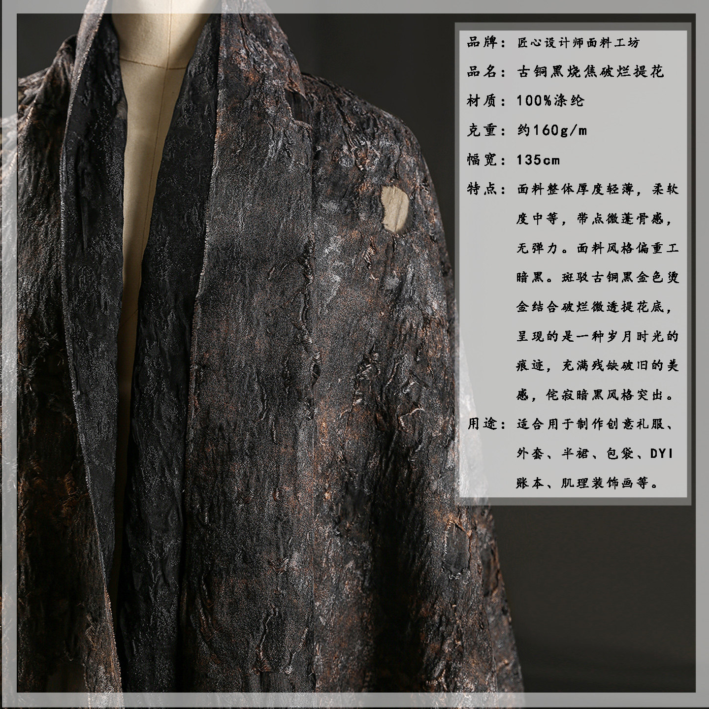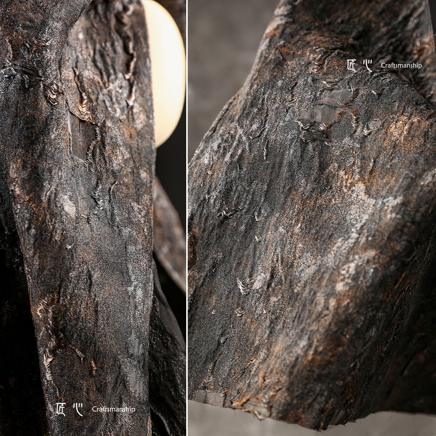 📚 古铜黑棕烧焦破烂提花重肌理布 原创做旧树皮镂空diy服装设计面料