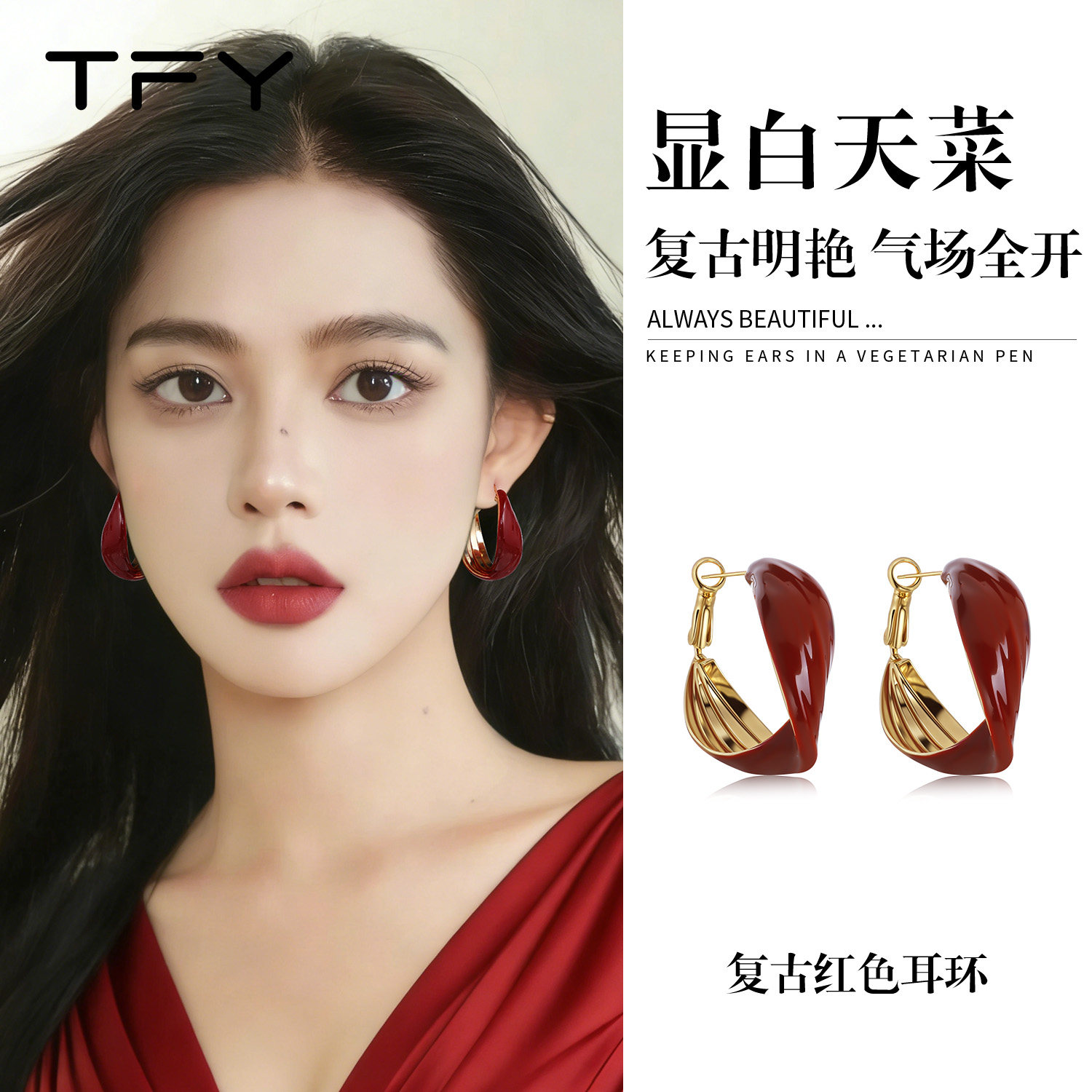 📚 复古红色耳圈2026超火耳环轻奢高级感气质大气百搭耳饰女独特漂亮